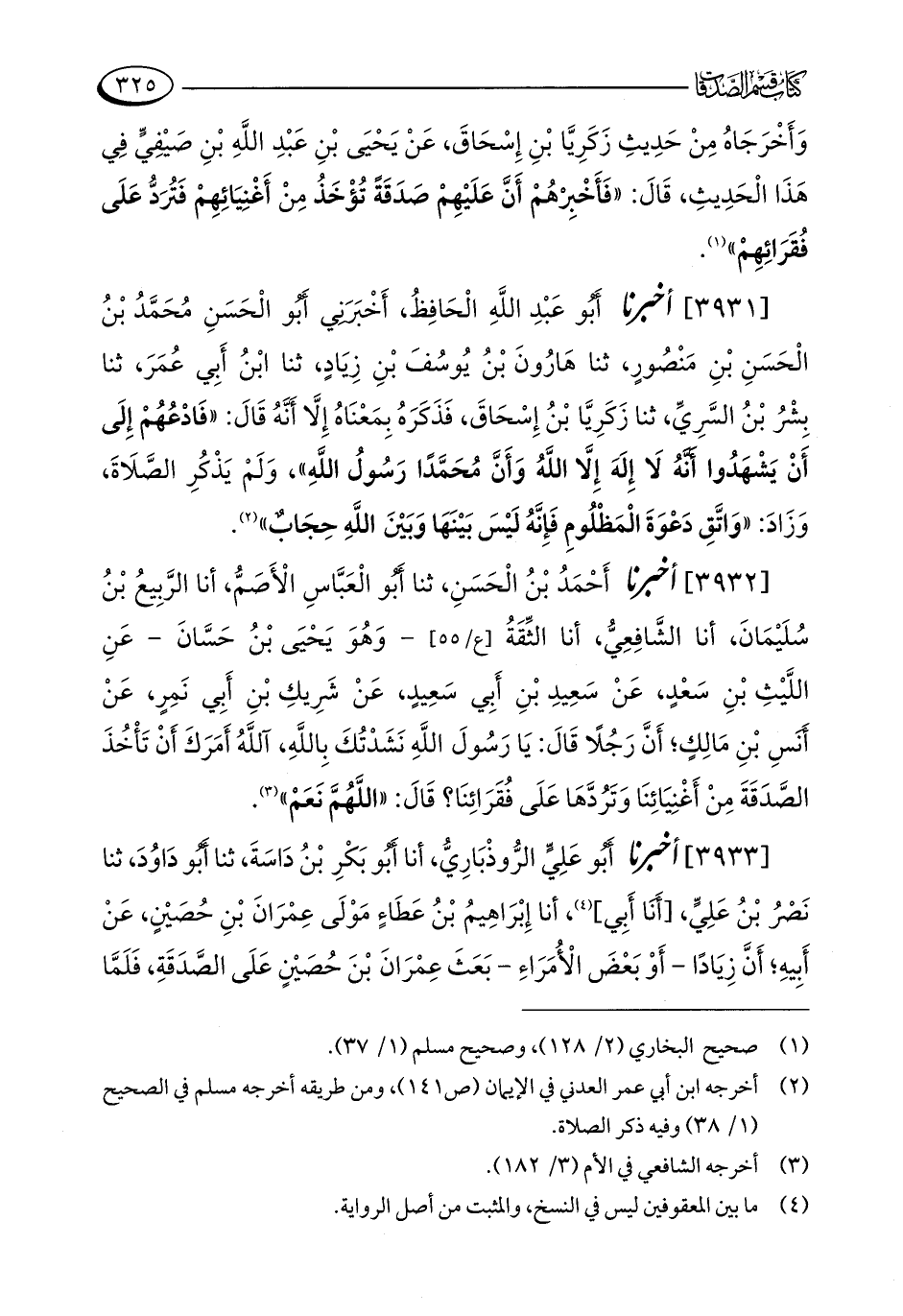 [3932] أخبرنا أَحْمَدُ بْنُ الْحَسَنِ، ثنا أَبُو الْعَبَّاسِ الْأَصَمُّ، أنا الرَّبِيعُ بْنُ سُلَيْمَانَ، أنا الشَّافِعِيُّ، أنا الثِّقَةُ - وَهُوَ يَحْيَى بْنُ حَسَّانَ - عَنِ اللَّيْثِ بْنِ سَعْدٍ، عَنْ سَعِيدِ بْنِ أَبِي سَعِيدٍ، عَنْ شَرِيكِ بْنِ أَبِي نَمِرٍ، عَنْ أَنَسِ بْنِ مَالِكٍ؛ أَنَّ رَجُلًا قَالَ: يَا رَسُولَ اللَّهِ نَشَدْتُكَ بِاللَّهِ، آللَّهُ أَمَرَكَ أَنْ تَأْخُذَ الصَّدَقَةَ مِنْ أَغْنِيَائِنَا وَتَرُدَّهَا عَلَى فُقَرَائِنَا؟ قَالَ: "اللَّهُمَّ نَعَمْ" (¬3).