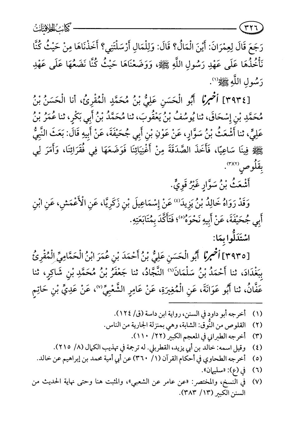 [3935] أخبرنا أَبُو الْحَسَنِ عَلِيُّ بْنُ أَحْمَدَ بْنِ عُمَرَ ابْنُ الْحَمَّامِيِّ الْمُقْرِئُ بِبَغْدَادَ، ثنا أَحْمَدُ بْنُ سَلْمَانَ (¬6) النَّجَّادُ، ثنا جَعْفَرُ بْنُ مُحَمَّدِ بْنِ شَاكِرٍ، ثنا عَفَّانُ، ثنا أَبُو عَوَانَةَ، عَنِ الْمُغِيرَةِ، عَنْ عَامِرٍ الشَّعْبِيِّ (¬7)، عَنْ عَدِيِّ بْنِ حَاتِمٍ