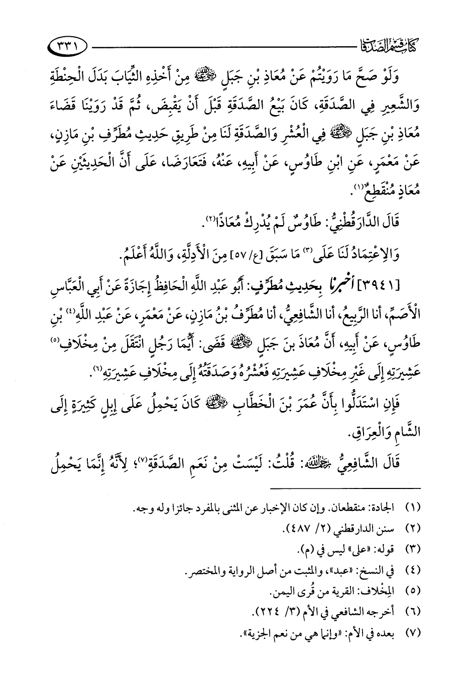 [3941] أخبرنا بِحَدِيثِ مُطَرِّفٍ: أَبُو عَبْدِ اللَّهِ الْحَافِظُ إِجَازَةً عَنْ أَبِي الْعَبَّاسِ الْأَصَمِّ، أنا الرَّبِيعُ، أنا الشَّافِعِيُّ، أنا مُطَرِّفُ بْنُ مَازِنٍ، عَنْ مَعْمَرٍ، عَنْ عَبْدِ اللَّهِ (¬4) بْنِ طَاوُسٍ، عَنْ أَبِيهِ، أَنَّ مُعَاذَ بنَ جَبَلٍ - رضي الله عنه - قَضَى: أَيُّمَا رَجُلٍ انْتَقَلَ مِنْ مِخْلَافِ (¬5) عَشِيرَتِهِ إِلَى غَيْرِ مِخْلَافِ عَشِيرَتِهِ فَعُشْرُهُ وَصَدَقَتُهُ إِلَى مِخْلَافِ عَشِيرَتِهِ (¬6).