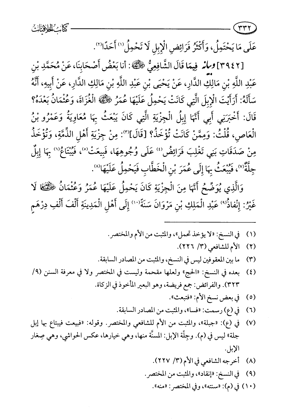 [3942] وبيانه فِيمَا قَالَ الشَّافِعِيُّ - رضي الله عنه -: أنا بَعْضُ أَصْحَابِنَا، عَنْ مُحَمَّدِ بْنِ عَبْدِ اللَّهِ بْنِ مَالِكِ الدَّارِ، عَنْ يَحْيَى بْنِ عَبْدِ اللَّهِ بْنِ مَالِكِ الدَّارِ، عَنْ أَبِيهِ، أَنَّهُ سَأَلَهُ: أَرَأَيْتَ الْإِبِلَ الَّتِي كَانَتْ يَحْمِلُ عَلَيْهَا عُمَرُ - رضي الله عنه - الْغُزَاةَ، وَعُثْمَانُ بَعْدَهُ؟ قَالَ: أَخْبَرَنِي أَبِي أَنَّهَا إِبِلُ الْجِزْيَةِ الَّتِي كَانَ يَبْعَثُ بِهَا مُعَاوِيَةُ وَعَمْرُو بْنُ الْعَاصِ، قُلْتُ: وَمِمَّنْ كَانَتْ تُؤْخَذُ؟ [قَالَ] (¬3): مِنْ جِزْيَةِ أَهْلِ الذِّمَّةِ، وَتُؤْخَذُ مِنْ صَدَقَاتِ بَنِي تَغْلِبَ فَرَائِضُ (¬4) عَلَى وُجُوهِهَا، فَبِيعَتْ (¬5)، فَيُبْتَاعُ (¬6) بِهَا إِبِلٌ جِلَّةٌ (¬7)، فَيُبْعَثُ بِهَا إِلَى عُمَرَ بْنِ الْخَطَّابِ فَيَحْمِلُ عَلَيْهَا (¬8).