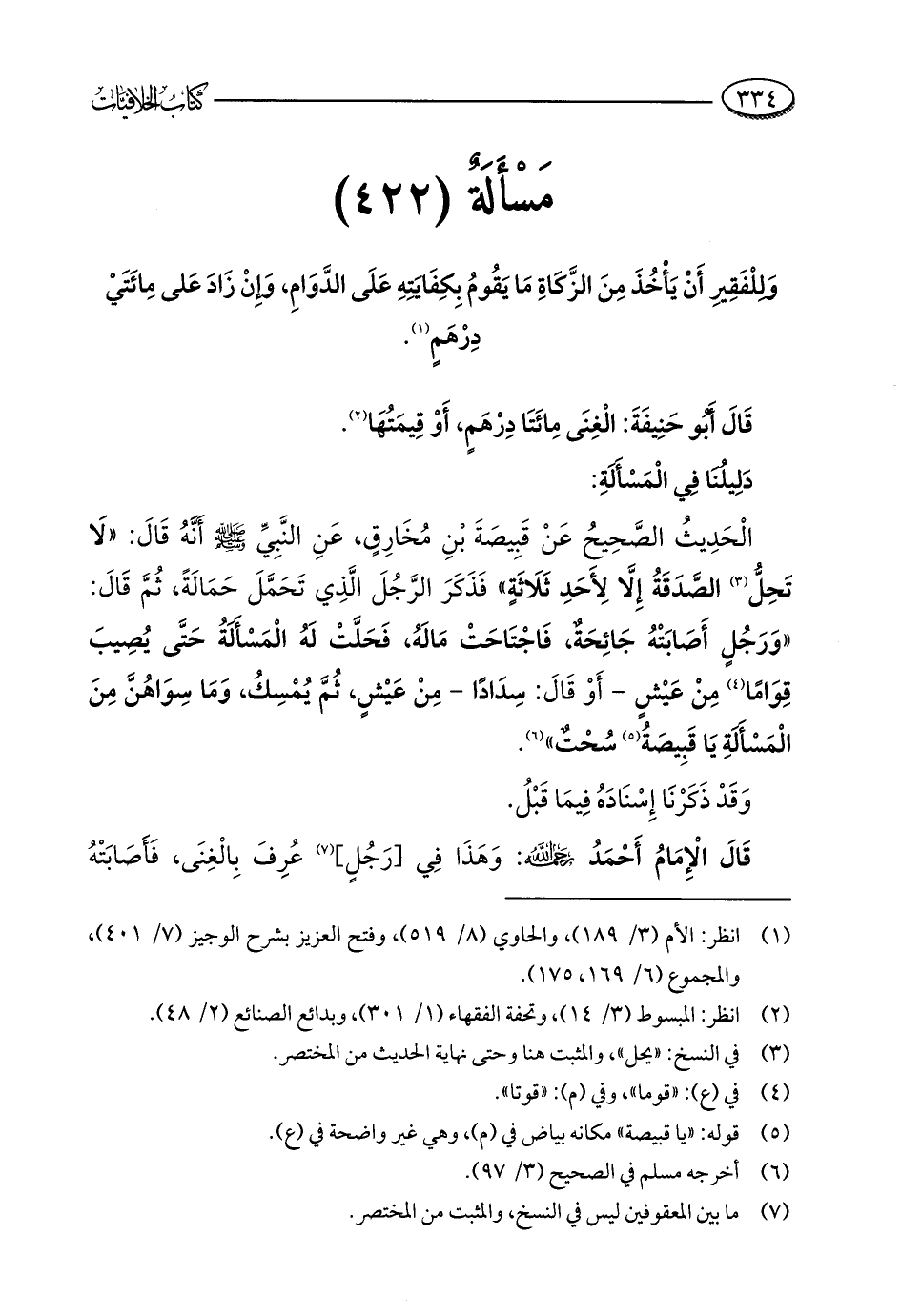 الْحَدِيثُ الصَّحِيحُ عَنْ قَبِيصَةَ بْنِ مُخَارِقٍ، عَنِ النَّبِيِّ - صلى الله عليه وسلم - أَنَّهُ قَالَ: "لَا تَحِلُّ (¬3) الصَّدَقَةُ إِلَّا لِأَحَدِ ثَلَاثَةٍ" فَذَكَرَ الرَّجُلَ الَّذِي تَحَمَّلَ حَمَالَةً، ثُمَّ قَالَ: "وَرَجُلٍ أَصَابَتْهُ جَائِحَةٌ، فَاجْتَاحَتْ مَالَهُ، فَحَلَّتْ لَهُ الْمَسْأَلَةُ حَتَّى يُصِيبَ قِوَامًا (¬4) مِنْ عَيْشٍ - أَوْ قَالَ: سِدَادًا - مِنْ عَيْشٍ، ثُمَّ يُمْسِكُ، وَمَا سِوَاهُنَّ مِنَ الْمَسْأَلَةِ يَا قَبِيصَةُ (¬5) سُحْتٌ" (¬6).