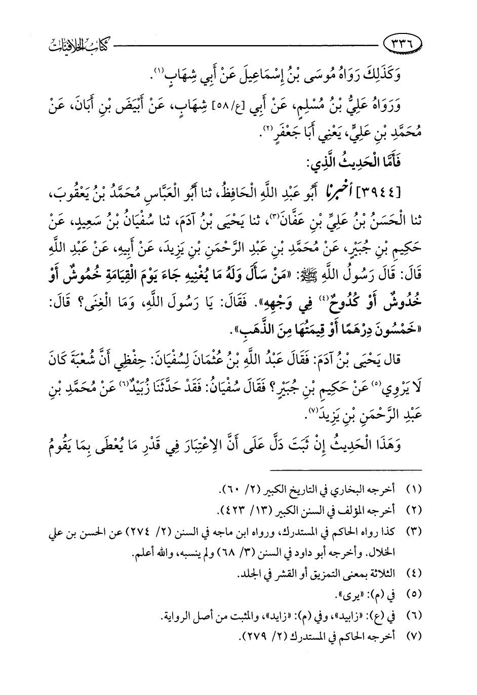 [3944] أخبرنا أَبُو عَبْدِ اللَّهِ الْحَافِظُ، ثنا أَبُو الْعَبَّاسِ مُحَمَّدُ بْنُ يَعْقُوبَ، ثنا الْحَسَنُ بْنُ عَلِيِّ بْنِ عَفَّانَ (¬3)، ثنا يَحْيَى بْنُ آدَمَ، ثنا سُفْيَانُ بْنُ سَعِيدٍ، عَنْ حَكِيمِ بْنِ جُبَيْرٍ، عَنْ مُحَمَّدِ بْنِ عَبْدِ الرَّحْمَنِ بْنِ يَزِيدَ، عَنْ أَبِيهِ، عَنْ عَبْدِ اللَّهِ قَالَ: قَالَ رَسُولُ اللَّهِ - صلى الله عليه وسلم -: "مَنْ سَأَلَ وَلَهُ مَا يُغْنِيهِ جَاءَ يَوْمَ الْقِيَامَةِ خُمُوشٌ أَوْ خُدُوشٌ أَوْ كُدُوحٌ (¬4) فِي وَجْهِهِ". فَقَالَ: يَا رَسُولَ اللَّهِ، وَمَا الْغِنَى؟ قَالَ: "خَمْسُونَ دِرْهَمًا أَوْ قِيمَتُهَا مِنَ الذَّهَبِ".