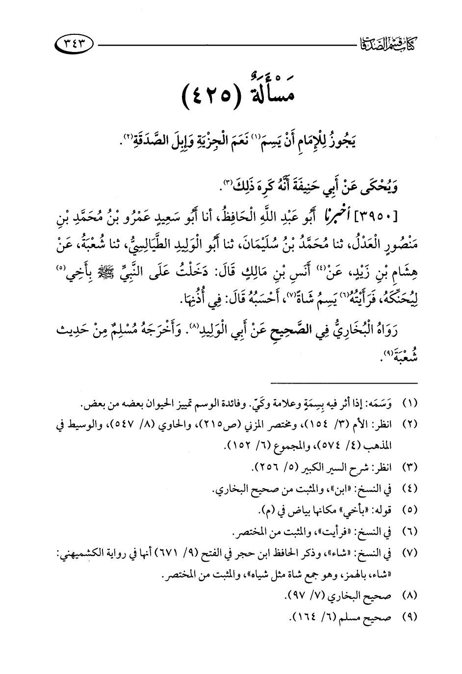 مَسْأَلَةٌ (425): يَجُوزُ لِلْإِمَامِ أَنْ يَسِمَ (¬1) نَعَمَ الْجِزْيَةِ وَإِبِلَ الصَّدَقَةِ (¬2).