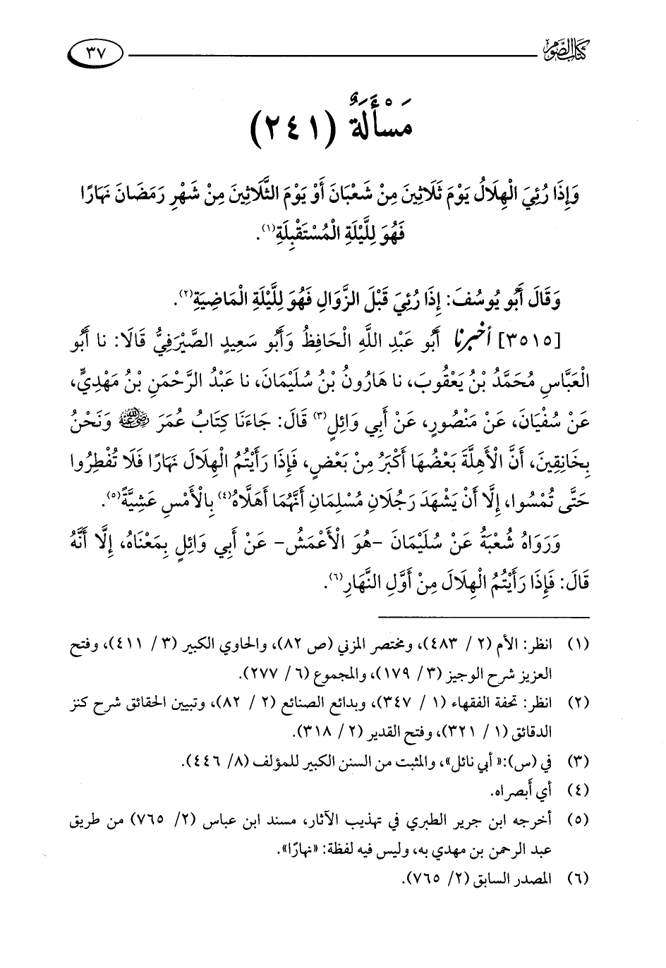 [3515] أخبرنا أبو عَبْدِ اللَّهِ الْحَافِظُ وَأَبُو سَعِيدٍ الصَّيْرَفِيُّ قَالَا: نا أَبُو الْعَبَّاسِ مُحَمَّدُ بْنُ يَعْقُوبَ، نا هَارُونُ بْنُ سُلَيْمَانَ، نا عَبْدُ الرَّحْمَنِ بْنُ مَهْدِيٍّ، عَنْ سُفْيَانَ، عَنْ مَنْصُورٍ، عَنْ أَبِي وَائِلٍ (¬3) قَالَ: جَاءَنَا كِتَابُ عُمَرَ - رضي الله عنه - وَنَحْنُ بِخَانِقِينَ، أَنَّ الْأَهِلَّةَ بَعْضُهَا أَكْبَرُ مِنْ بَعْضٍ، فَإِذَا رَأَيْتُمُ الْهِلَالَ نَهَارًا فَلَا تُفْطِرُوا حَتَّى تُمْسُوا، إِلَّا أَنْ يَشْهَدَ رَجُلَانِ مُسْلِمَانِ أَنَّهُمَا أَهَلَّاهُ (¬4) بِالْأَمْسِ عَشِيَّةً (¬5).