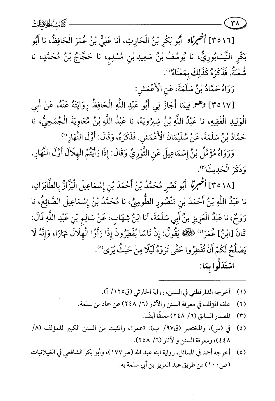 [3518] أخبرنا أَبُو نَصْرٍ مُحَمَّدُ بْنُ أَحْمَدَ بْنِ إِسْمَاعِيلَ الْبَزَّازُ بِالطَّابَرَانِ، نا عَبْدُ اللَّهِ بْنُ أَحْمَدَ بْنِ مَنْصُورٍ الطُّوسِيُّ، نا مُحَمَّدُ بْنُ إِسْمَاعِيلَ الصَّائِغُ، نا رَوْحٌ، نا عَبْدُ الْعَزِيزِ بْنُ أَبِي سَلَمَةَ، أنا ابْنُ شِهَابٍ، عَنْ سَالِمِ بْنِ عَبْدِ اللَّهِ قَالَ: كَانَ [ابْنُ] عُمَرَ (¬4) - رضي الله عنه - يَقُولُ: إِنَّ نَاسًا يُفْطِرُونَ إِذَا رَأَوُا الْهِلَالَ نَهَارًا، وَإِنَّهُ لَا يَصْلُحُ لَكُمْ أَنْ تُفْطِرُوا حَتَّى تَرَوْهُ لَيْلًا مِنْ حَيْثُ يُرَى (¬5).