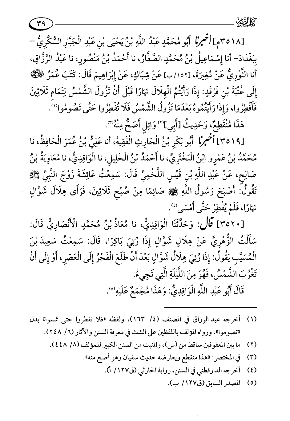 [3518 م] أخبرنا أَبُو مُحَمَّدٍ عَبْدُ اللَّهِ بْنُ يَحْيَى بْنِ عَبْدِ الْجَبَّارِ السُّكَّرِيُّ - بِبَغْدَادَ - أنا إِسْمَاعِيلُ بْنُ مُحَمَّدٍ الصَّفَّارُ، نا أَحْمَدُ بْنُ مَنْصُورٍ، نا عَبْدُ الرَّزَّاقِ، أنا الثَّوْرِيُّ عَنْ مُغِيرَةَ، عَنْ شِبَاكٍ، عَنْ إِبْرَاهِيمَ قَالَ: كَتَبَ عُمَرُ - رضي الله عنه - إِلَى عُتْبَةَ بْنِ فَرْقَدٍ: إِذَا رَأَيْتُمُ الْهِلَالَ نَهَارًا قَبْلَ أَنْ تَزُولَ الشَّمْسُ لِتَمَامِ ثَلَاثِينَ فَأفْطِرُوا، وَإِذَا رَأَيْتُمُوهُ بَعْدَمَا تَزُولُ الشَّمْسُ فَلَا تُفْطِرُوا حَتَّى تَصُومُوا (¬1).
