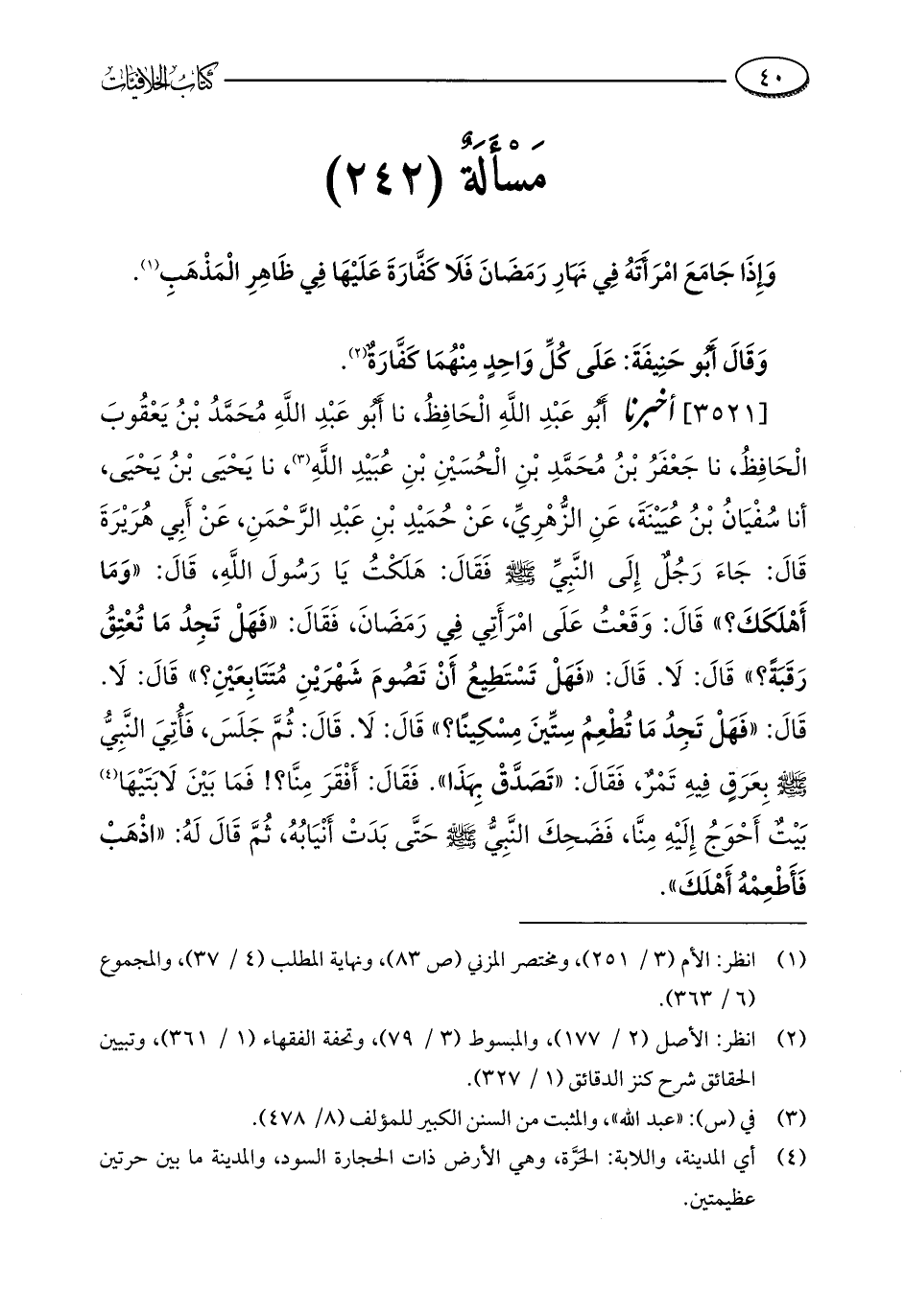 [3521] أخبرنا أَبُو عَبْدِ اللَّهِ الْحَافِظُ، نا أَبُو عَبْدِ اللَّهِ مُحَمَّدُ بْنُ يَعْقُوبَ الْحَافِظُ، نا جَعْفَرُ بْنُ مُحَمَّدِ بْنِ الْحُسَيْنِ بْنِ عُبَيْدِ اللَّهِ (¬3)، نا يَحْيَى بْنُ يَحْيَى، أنا سُفْيَانُ بْنُ عُيَيْنَةَ، عَنِ الزُّهْرِيِّ، عَنْ حُمَيْدِ بْنِ عَبْدِ الرَّحْمَنِ، عَنْ أَبِي هُرَيْرَةَ قَالَ: جَاءَ رَجُلٌ إِلَى النَّبِيِّ - صلى الله عليه وسلم - فَقَالَ: هَلَكْتُ يَا رَسُولَ اللَّهِ، قَالَ: "وَمَا أَهْلَكَكَ؟ " قَالَ: وَقَعْتُ عَلَى امْرَأَتِي فِي رَمَضَانَ، فَقَالَ: "فَهَلْ تَجِدُ مَا تُعْتِقُ رَقَبَةً؟ " قَالَ: لَا. قَالَ: "فَهَلْ تَسْتَطِيعُ أَنْ تَصُومَ شَهْرَيْنِ مُتَتَابِعَيْنِ؟ " قَالَ: لَا. قَالَ: "فَهَلْ تَجِدُ مَا تُطْعِمُ سِتِّينَ مِسْكِينًا؟ " قَالَ: لَا. قَالَ: ثُمَّ جَلَسَ، فَأُتِيَ النَّبِيُّ - صلى الله عليه وسلم - بِعَرَقٍ فِيهِ تَمْرٌ، فَقَالَ: "تَصَدَّقْ بِهَذَا". فَقَالَ: أَفْقَرَ مِنَّا؟ ! فَمَا بَيْنَ لَابَتَيْهَا (¬4) بَيْتٌ أَحْوَجُ إِلَيْهِ مِنَّا، فَضَحِكَ النَّبِيُّ - صلى الله عليه وسلم - حتَّى بَدَتْ أَنْيَابُهُ، ثُمَّ قَالَ لَهُ: "اذْهَبْ فَأَطْعِمْهُ أَهْلَكَ".