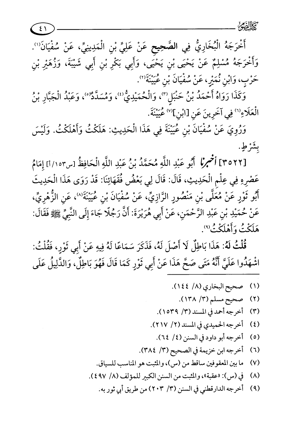 [3522] أخبرنا أَبُو عَبْدِ اللَّهِ مُحَمَّدُ بْنُ عَبْدِ اللَّهِ الْحَافِظُ إِمَامُ عَصْرِهِ فِي عِلْمِ الْحَدِيثِ، قَالَ: قَالَ لِي بَعْضُ فُقَهَائِنَا: قَدْ رَوَى هَذَا الْحَدِيثَ أَبُو ثَوْرٍ عَنْ مُعَلَّى بْنِ مَنْصُورٍ الرَّازِيِّ، عَنْ سُفْيَانَ بْنِ عُيَيْنَةَ (¬8)، عَنِ الزُّهْرِيِّ، عَنْ حُمَيْدِ بْنِ عَبْدِ الرَّحْمَنِ، عَنْ أَبِي هُرَيْرَةَ: أَنَّ رَجُلًا جَاءَ إِلَى النَّبِيِّ - صلى الله عليه وسلم - فَقَالَ: هَلَكْتُ وَأَهْلَكْتُ (¬9).