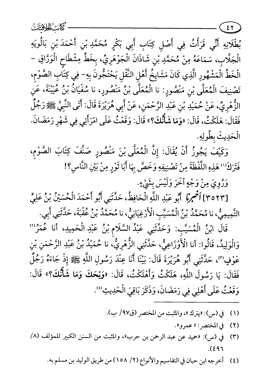 بُطْلَانِهِ أَنِّي قَرَأْتُ فِي أَصْلِ كِتَابِ أَبِي بَكْرٍ مُحَمَّدِ بْنِ أَحْمَدَ بْنِ بَالُويَهِ الْجَلَّابِ، سَمَاعَهُ مِنْ مُحَمَّدِ بْنِ شَاذَانَ الْجَوْهَرِيِّ، بِخَطِّ مِشْطَاحٍ الْوَرَّاقِ - الْخَطِّ الْمَشْهُورِ الَّذِي كَانَ مَشَايِخُ أَهْلِ النَّقْلِ يَحْتَجُّونَ بِهِ - فِي كِتَابِ الصَّوْمِ، تَصْنِيفَ الْمُعَلَّى بْنِ مَنْصُورٍ: نا الْمُعَلَّى بْنُ مَنْصُورٍ، نا سُفْيَانُ بْنُ عُيَيْنَةَ، عَنِ الزُّهْرِيِّ، عَنْ حُمَيْدِ بْنِ عَبْدِ الرَّحْمَنِ، عَنْ أَبِي هُرَيْرَةَ قَالَ: أَتَى النَّبِيَّ - صلى الله عليه وسلم - رَجُلٌ فَقَالَ: هَلَكْتُ، قَالَ: "وَمَا شَأْنُكَ؟ " قَالَ: وَقَعْتُ عَلَى امْرَأَتِي فِي شَهْرِ رَمَضَانَ. الْحَدِيثَ بِطُولِهِ.