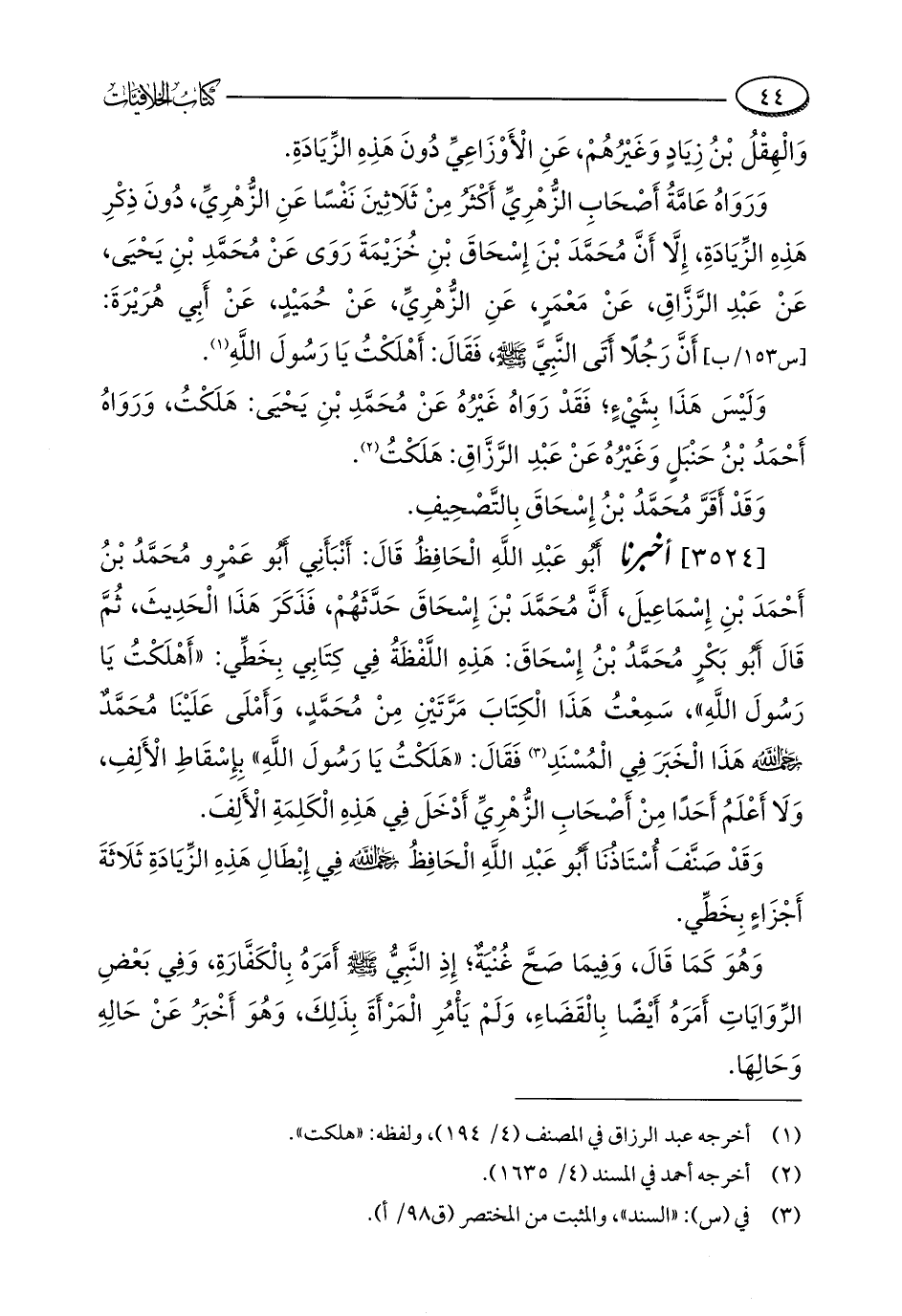 [3524] أخبرنا أَبُو عَبْدِ اللَّهِ الْحَافِظُ قَالَ: أَنْبَأَنِي أَبُو عَمْرٍو مُحَمَّدُ بْنُ أَحْمَدَ بْنِ إِسْمَاعِيلَ، أَنَّ مُحَمَّدَ بْنَ إِسحَاقَ حَدَّثَهُمْ، فَذَكَرَ هَذَا الْحَدِيثَ، ثُمَّ قَالَ أَبُو بَكْرٍ مُحَمَّدُ بْنُ إِسحَاقَ: هَذِهِ اللَّفْظَةُ فِي كِتَابِي بِخَطِّي: "أَهْلَكْتُ يَا رَسُولَ اللَّهِ"، سَمِعْتُ هَذَا الْكِتَابَ مَرَّتَيْنِ مِنْ مُحَمَّدٍ، وَأَمْلَى عَلَيْنَا مُحَمَّدٌ - رحمه الله - هَذَا الْخَبَرَ فِي الْمُسْنَدِ (¬3) فَقَالَ: "هَلَكْتُ يَا رَسُولَ اللَّهِ" بِإِسْقَاطِ الْأَلِفِ، وَلَا أَعْلَمُ أَحَدًا مِنْ أَصْحَابِ الزُّهْرِيِّ أَدْخَلَ فِي هَذِه الْكَلِمَةِ الْأَلِفَ.