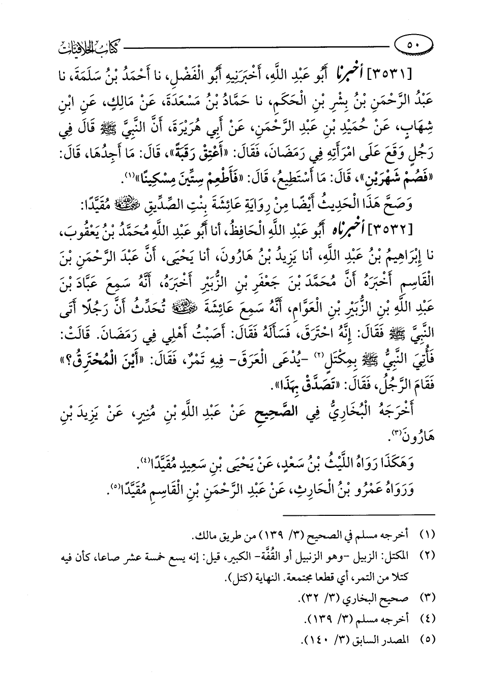 [3531] أخبرنا أَبو عَبْدِ اللَّهِ، أَخْبَرَنِيهِ أَبُو الْفَضْلِ، نا أَحْمَدُ بْنُ سَلَمَةَ، نا عَبْدُ الرَّحْمَنِ بْنُ بِشْرِ بْنِ الْحَكَمِ، نا حَمَّادُ بْنُ مَسْعَدَةَ، عَنْ مَالِكٍ، عَنِ ابْنِ شِهَابٍ، عَنْ حُمَيْدِ بْنِ عَبْدِ الرَّحْمَنِ، عَنْ أَبِي هُرَيْرَةَ، أَنَّ النَّبِيَّ - صلى الله عليه وسلم - قَالَ فِي رَجُلٍ وَقَعَ عَلَى امْرَأَتِهِ فِي رَمَضَانَ، فَقَالَ: "أَعْتِقْ رَقَبَةً"، قَالَ: مَا أَجِدُهَا، قَالَ: "فَصُمْ شَهْرَيْنِ"، قَالَ: مَا أَسْتَطِيعُ، قَالَ: "فَأَطْعِمْ سِتِّينَ مِسْكِينًا" (¬1).