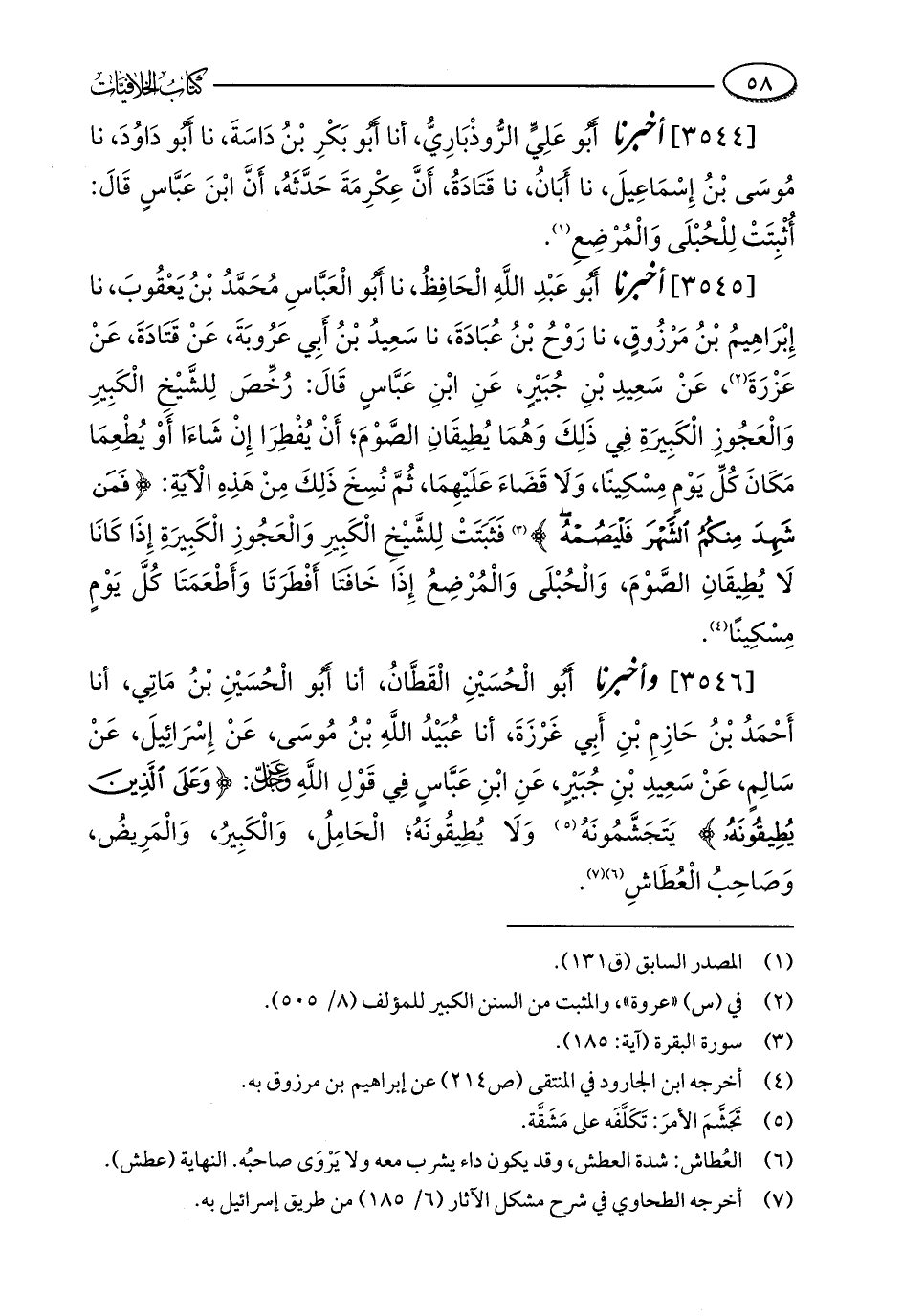 [3546] وأخبرنا أبو الْحُسَيْنِ الْقَطَّانُ، أنا أَبُو الْحُسَيْنِ بْنُ مَاتِي، أنا أَحْمَدُ بْنُ حَازِمِ بْنِ أَبِي غَرْزَةَ، أنا عُبَيْدُ اللَّهِ بْنُ مُوسَى، عَنْ إِسْرَائِيلَ، عَنْ سَالِمٍ، عَنْ سَعِيدِ بْنِ جُبَيْرٍ، عَنِ ابْنِ عَبَّاسٍ فِي قَوْلِ اللَّهِ - عز وجل -: {وَعَلَى الَّذِينَ يُطِيقُونَهُ} يَتَجَشَّمُونَهُ (¬5) وَلَا يُطِيقُونَهُ؛ الْحَامِلُ، وَالْكَبِيرُ، وَالْمَرِيضُ، وَصَاحِبُ الْعُطَاشِ (¬6) (¬7).