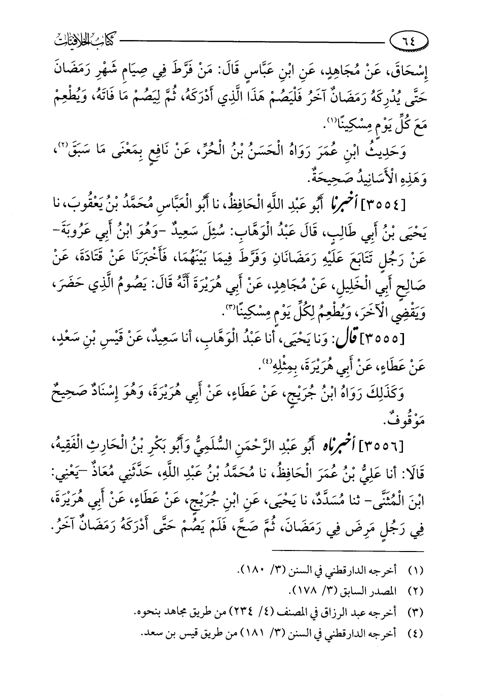 [3554] أخبرنا أَبُو عَبْدِ اللَّهِ الْحَافِظُ، نا أَبُو الْعَبَّاسِ مُحَمَّدُ بْنُ يَعْقُوبَ، نا يَحْيَى بْنُ أَبِي طَالِبٍ، قَالَ عَبْدُ الْوَهَّابِ: سُئِلَ سَعِيدٌ - وَهُوَ ابْنُ أَبِي عَرُوبَةَ - عَنْ رَجُلٍ تَتَابَعَ عَلَيْهِ رَمَضَانَانِ وَفَرَّطَ فِيمَا بَيْنَهُمَا، فَأَخْبَرَنَا عَنْ قَتَادَةَ، عَنْ صَالِحٍ أَبِي الْخَلِيلِ، عَنْ مُجَاهِدٍ، عَنْ أَبِي هُرَيْرَةَ أنَّهُ قَالَ: يَصُومُ الَّذِي حَضَرَ، وَيَقْضِي الْآخَرَ، وَيُطْعِمُ لِكُلِّ يَوْمٍ مِسْكِينًا (¬3).