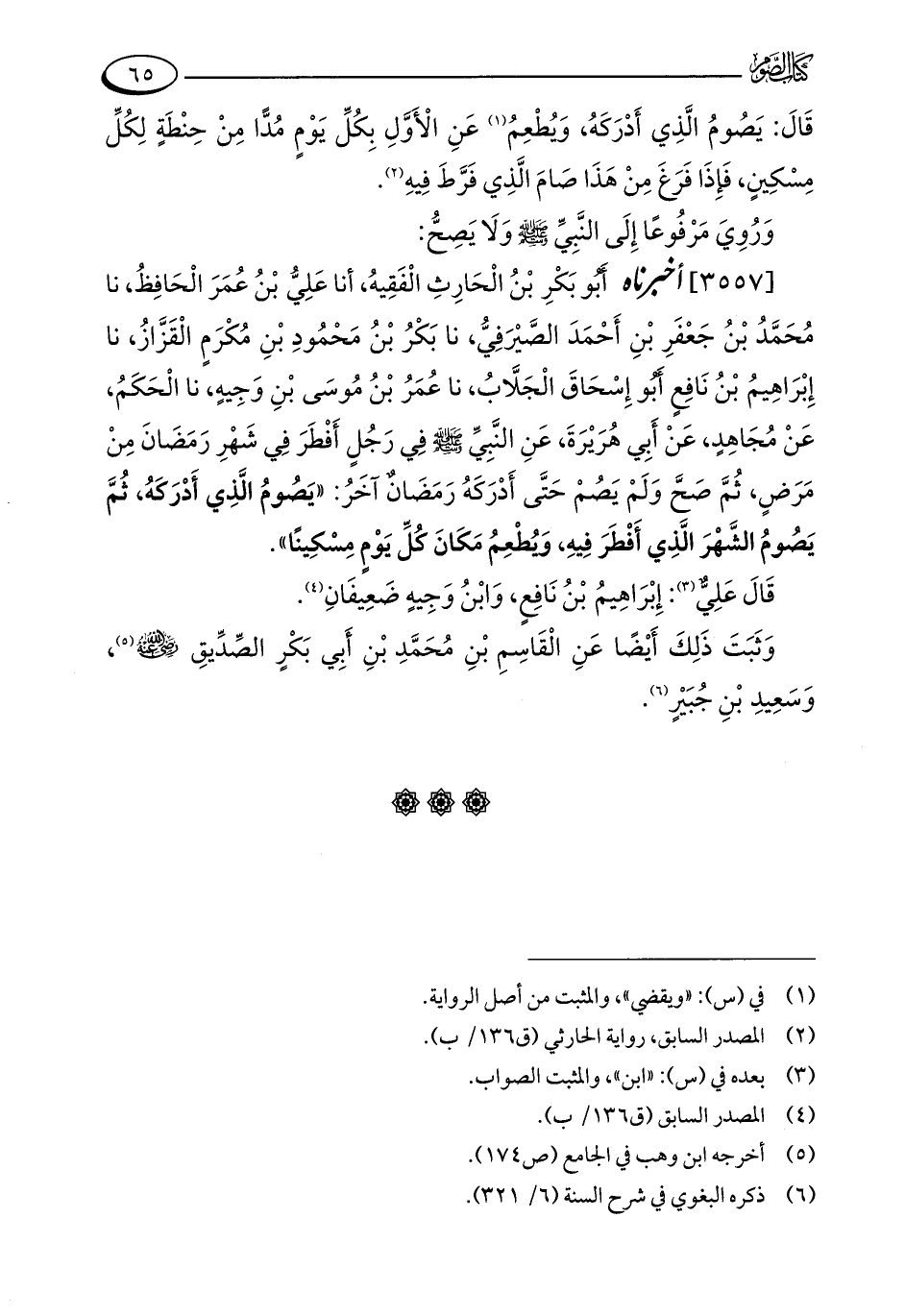 [3557] أخبرناه أَبُو بَكْرِ بْنُ الْحَارِثِ الْفَقِيهُ، أنا عَلِيُّ بْنُ عُمَرَ الْحَافِظُ، نا مُحَمَّدُ بْنُ جَعْفَرِ بْنِ أَحْمَدَ الصَّيْرَفِيُّ، نا بَكْرُ بْنُ مَحْمُودِ بْنِ مُكْرَمٍ الْقَزَّازُ، نا إِبْرَاهِيمُ بْنُ نَافِعٍ أَبُو إِسْحَاقَ الْجَلَّابُ، نا عُمَرُ بْنُ مُوسَى بْنِ وَجِيهٍ، نا الْحَكَمُ، عَنْ مُجَاهِدٍ، عَنْ أَبِي هُرَيْرَةَ، عَنِ النَّبِيِّ - صلى الله عليه وسلم - فِي رَجُلٍ أَفْطَرَ فِي شَهْرِ رَمَضَانَ مِنْ مَرَضٍ، ثُمَّ صَحَّ وَلَمْ يَصُمْ حَتَّى أَدْرَكَهُ رَمَضَانٌ آخَرُ: "يَصُومُ الَّذِي أَدْرَكَهُ، ثُمَّ يَصُومُ الشَّهْرَ الَّذِي أَفْطَرَ فِيهِ، وَيُطْعِمُ مَكَانَ كُلِّ يَوْمٍ مِسْكِينًا".