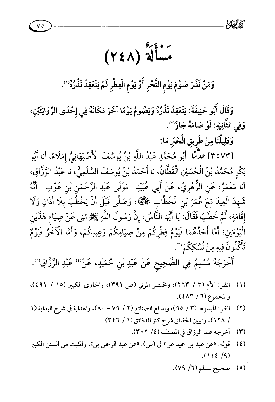 مَسْأَلَةٌ (248): وَمَنْ نَذَرَ صَوْمَ يَوْمِ النَّحْرِ أَوْ يَوْمِ الْفِطْرِ لَمْ يَنْعَقِدْ نَذْرُهُ (¬1).