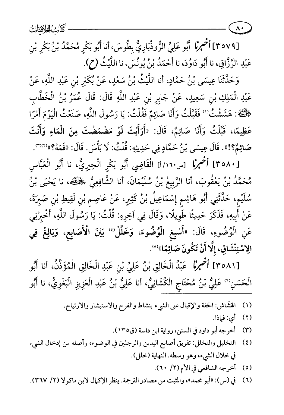 [3580] أخبرنا الْقَاضِي أَبُو بَكْرٍ الْحِيرِيُّ، نا أَبُو الْعَبَّاسِ مُحَمَّدُ بْنُ يَعْقُوبَ، أنا الرَّبِيعُ بْنُ سُلَيْمَانَ، أنا الشَّافِعِيُّ - رحمه الله -، نا يَحْيَى بْنُ سُلَيْمٍ، حَدَّثَنِي أَبُو هَاشِمٍ إِسْمَاعِيلُ بْنُ كَثِيرٍ، عَنْ عَاصِمِ بْنِ لَقِيطِ بْنِ صَبِرَةَ، عَنْ أَبِيهِ، فَذَكَرَ حَدِيثًا طَوِيلًا، وَقَالَ فِي آخِرِهِ: قُلْتُ: يَا رَسُولَ اللَّهِ، أَخْبِرْنِي عَنِ الْوُضُوءِ، قَالَ: "أَسْبِغِ الْوُضُوءَ، وَخَلِّلْ (¬4) بَيْنَ الْأَصَابِعِ، وَبَالِغْ فِي الِاسْتِنْشَاقِ، إِلَّا أَنْ تَكُونَ صَائِمًا" (¬5).