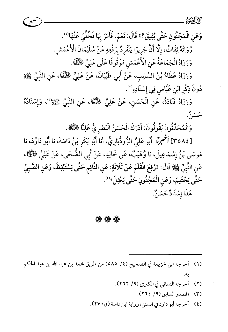 [3584] أخبرنا أَبُو عَلِيٍّ الرُّوذْبَارِيُّ، أنا أَبُو بَكْرِ بْنُ دَاسَةَ، نا أَبُو دَاوُدَ، نا مُوسَى بْنُ إِسْمَاعِيلَ، نا وُهَيْبٌ، عَنْ خَالِدٍ، عَنْ أَبِي الضُّحَى، عَنْ عَلِيٍّ - رضي الله عنه -، عَنِ النَّبِيِّ - صلى الله عليه وسلم - قَالَ: "رُفِعَ الْقَلَمُ عَنْ ثَلَاثَةٍ: عَنِ النَّائِمِ حَتَّى يَسْتَيْقِظَ، وَعَنِ الصَّبِيِّ حَتَّى يَحْتَلِمَ، وَعَنِ الْمَجْنُونِ حَتَّى يَعْقِلَ" (¬4).