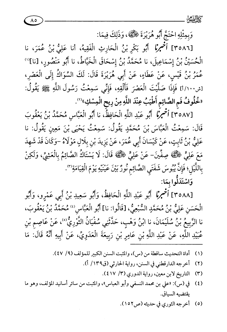[3587] أخبرنا أبو عَبْدِ اللَّهِ الْحَافِظُ، نا أبو الْعَبَّاسِ مُحَمَّدُ بْنُ يَعْقُوبَ قَالَ: سَمِعْتُ الْعَبَّاسَ بْنَ مُحَمَّدٍ يَقُولُ: سَمِعْتُ يَحْيَى بْنَ مَعِينٍ يَقُولُ: نا عَلِيُّ بْنُ ثَابِتٍ، عَنْ كَيْسَانَ أَبِي عُمَرَ، عَنْ يَزِيدَ بْنِ بِلَالٍ مَوْلَاهُ - وَكَانَ قَدْ شَهِدَ مَعَ عَلِيٍّ - رضي الله عنه - صِفِّينَ - عَنْ عَلِيٍّ - رضي الله عنه - قَالَ: لَا يَسْتَاكُ الصَّائِمُ بِالْعَشِيِّ، وَلَكِنْ بِاللَّيْلِ؛ فَإِنَّ يُبُوسَ شَفَتَيِ الصَّائِمِ نُورٌ بَيْنَ عَيْنَيْهِ يَوْمَ الْقِيَامَةِ (¬3).