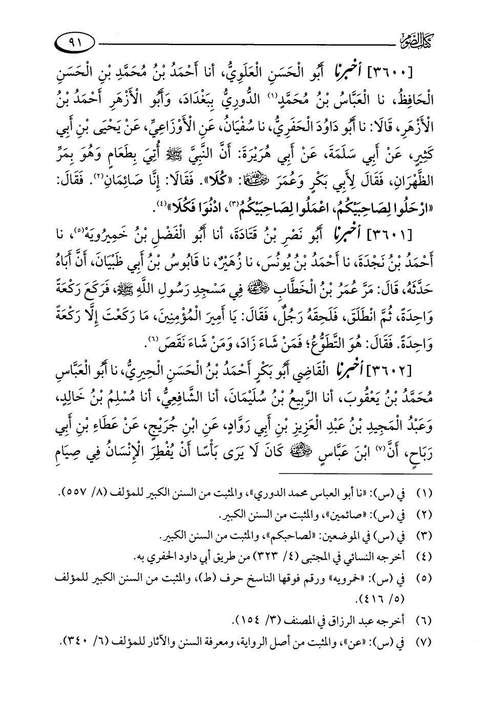 [3600] أخبرنا أبو الْحَسَنِ الْعَلَوِيُّ، أنا أَحْمَدُ بْنُ مُحَمَّدِ بْنِ الْحَسَنِ الْحَافِظُ، نا الْعَبَّاسُ بْنُ مُحَمَّدٍ (¬1) الدُّورِيُّ بِبَغْدَادَ، وَأَبُو الْأَزْهَرِ أَحْمَدُ بْنُ الْأَزْهَرِ، قَالَا: نا أبو دَاوُدَ الْحَفَرِيُّ، نا سُفْيَانُ، عَنِ الْأَوْزَاعِيِّ، عَنْ يَحْيَى بْنِ أَبِي كَثِيرٍ، عَنْ أَبِي سَلَمَةَ، عَنْ أَبِي هُرَيْرَةَ: أَنَّ النَّبِيَّ - صلى الله عليه وسلم - أُتِيَ بِطَعَامٍ وَهُوَ بِمَرِّ الظَّهْرَانِ، فَقَالَ لِأَبِي بَكْرٍ وَعُمَرَ - رضي الله عنهما -: "كُلَا". فَقَالَا: إِنَّا صَائِمَانِ (¬2). فَقَالَ: "ارْحَلُوا لِصَاحِبَيْكُمُ، اعْمَلُوا لِصَاحِبَيْكُمُ (¬3)، ادْنُوَا فَكُلَا" (¬4).
