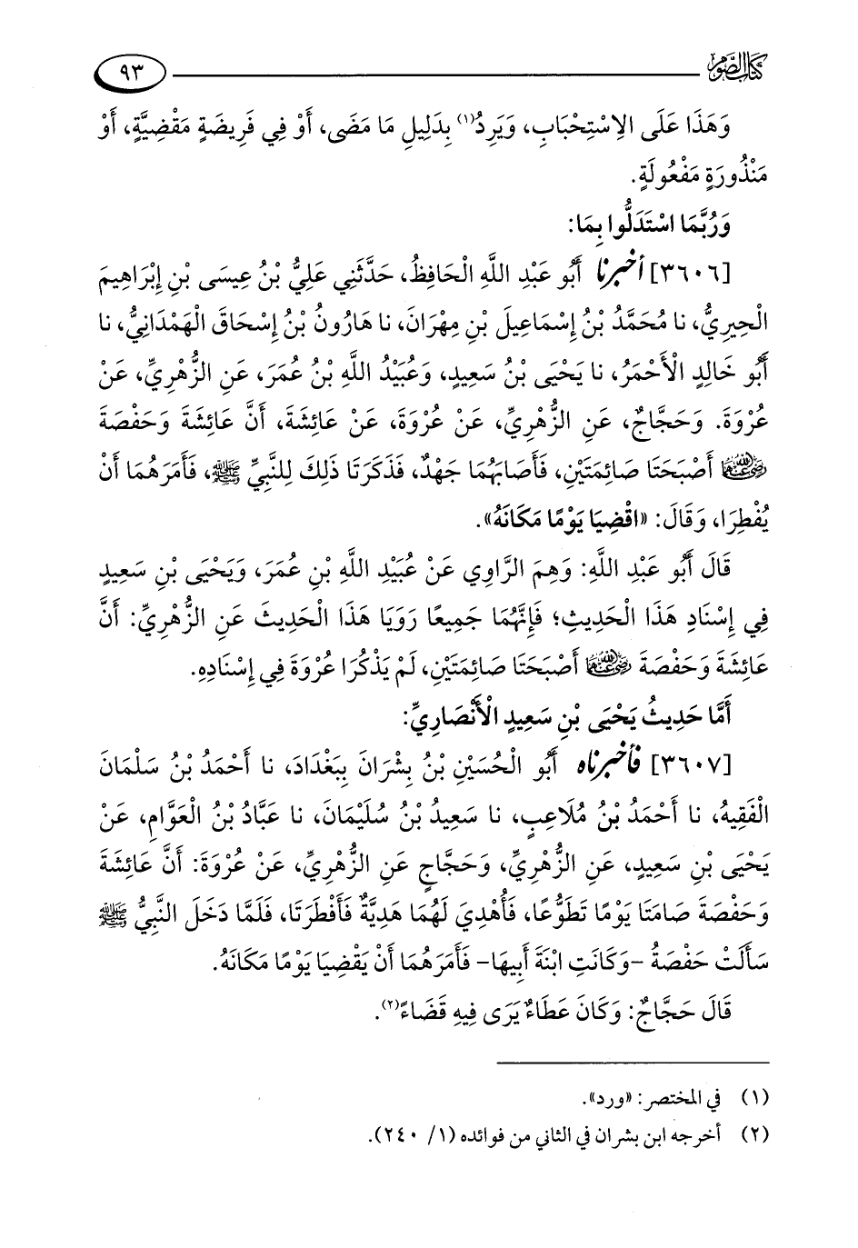 [3607] فأخبرناه أَبُو الْحُسَيْنِ بْنُ بِشْرَانَ بِبَغْدَادَ، نا أَحْمَدُ بْنُ سَلْمَانَ الْفَقِيهُ، نا أَحْمَدُ بْنُ مُلَاعِبٍ، نا سَعِيدُ بْنُ سُلَيْمَانَ، نا عَبَّادُ بْنُ الْعَوَّامِ، عَنْ يَحْيَى بْنِ سَعِيدٍ، عَنِ الزُّهْرِيِّ، وَحَجَّاجٍ عَنِ الزُّهْرِيِّ، عَنْ عُرْوَةَ: أَنَّ عَائِشَةَ وَحَفْصَةَ صَامَتَا يَوْمًا تَطَوُّعًا، فَأُهْدِيَ لَهُمَا هَدِيَّةٌ فَأَفْطَرَتَا، فَلَمَّا دَخَلَ النَّبِيُّ - صلى الله عليه وسلم - سَأَلَتْ حَفْصَةُ - وَكَانَتِ ابْنَةَ أَبِيهَا - فَأَمَرَهُمَا أَنْ يَقْضِيَا يَوْمًا مَكَانَهُ.