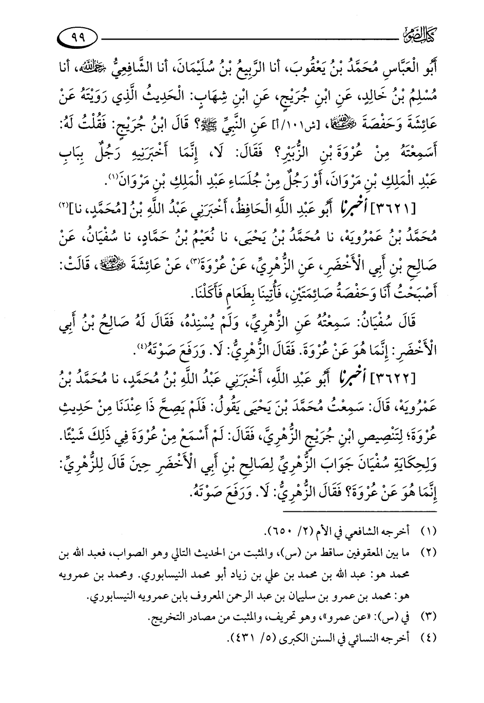 أَبُو الْعَبَّاسِ مُحَمَّدُ بْنُ يَعْقُوبَ، أنا الرَّبِيعُ بنُ سُلَيْمَانَ، أنا الشَّافِعِيُّ - رحمه الله -، أنا مُسْلِمُ بْنُ خَالِدٍ، عَنِ ابْنِ جُرَيْجٍ، عَنِ ابْنِ شِهَابٍ: الْحَدِيثُ الَّذِي رَوَيْتَهُ عَنْ عَائِشَةَ وَحَفْصَةَ - رضي الله عنهما -، عَنِ النَّبِيِّ - صلى الله عليه وسلم -؟ قَالَ ابْنُ جُرَيْجٍ: فَقُلْتُ لَهُ: أَسَمِعْتَهُ مِنْ عُرْوَةَ بْنِ الزُّبَيْرِ؟ فَقَالَ: لَا، إِنَّمَا أَخْبَرَنِيهِ رَجُلٌ بِبَابِ عَبْدِ الْمَلِكِ بْنِ مَرْوَانَ، أَوْ رَجُلٌ مِنْ جُلَسَاءِ عَبْدِ الْمَلِكِ بْنِ مَرْوَانَ (¬1).