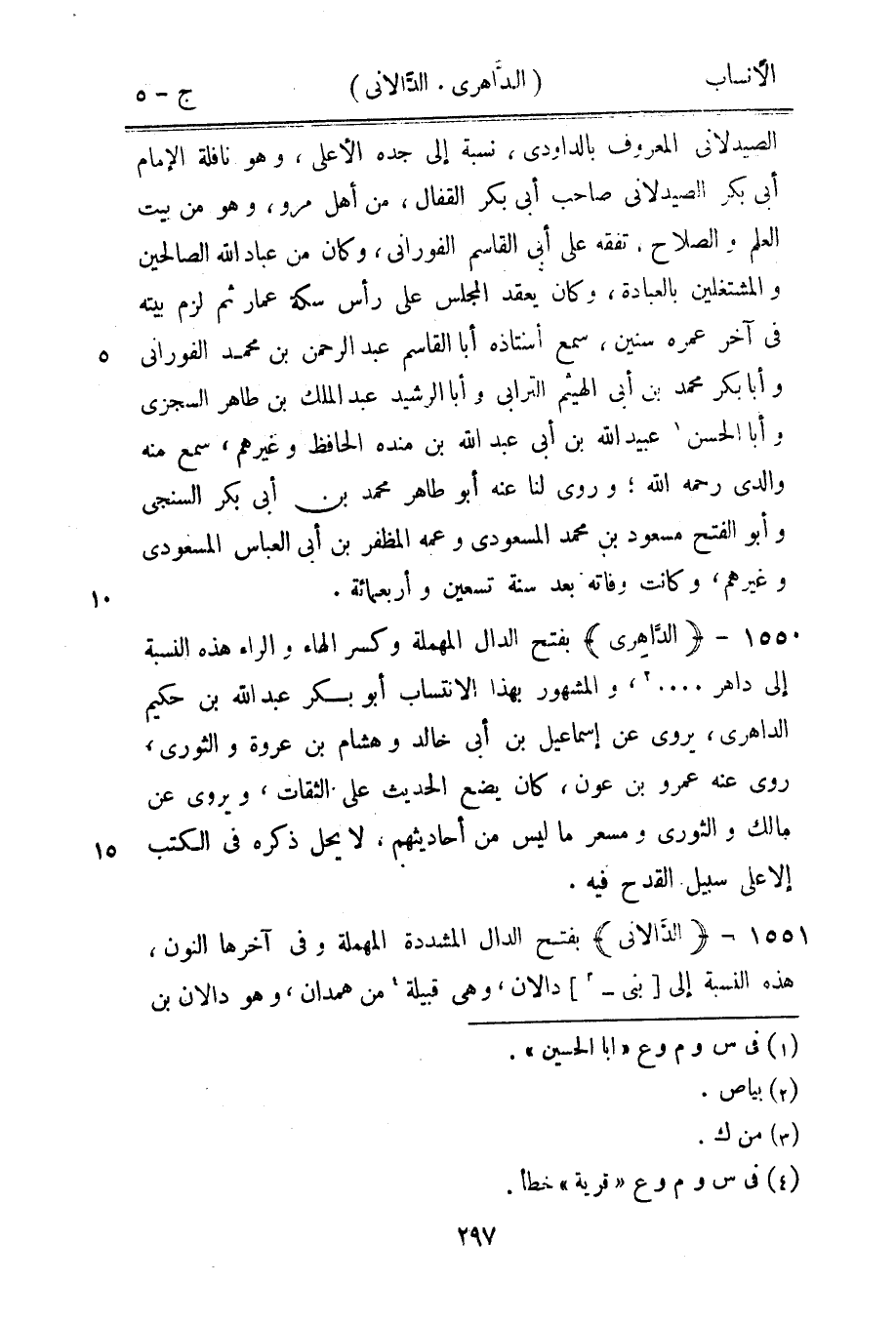 بفتح الدال المهملة وكسر الهاء والراء هذه النسبة إلى داهر.... [2] ، والمشهور بهذا الانتساب أبو بكر عبد الله بن حكيم الداهرى، يروى عن إسماعيل بن أبى خالد وهشام بن عروة والثوري، روى عنه عمرو بن عون، كان يضع الحديث على الثقات، ويروى عن مالك والثوري ومسعر ما ليس من أحاديثهم، لا يحل ذكره في الكتب إلا على سبيل القدح فيه.