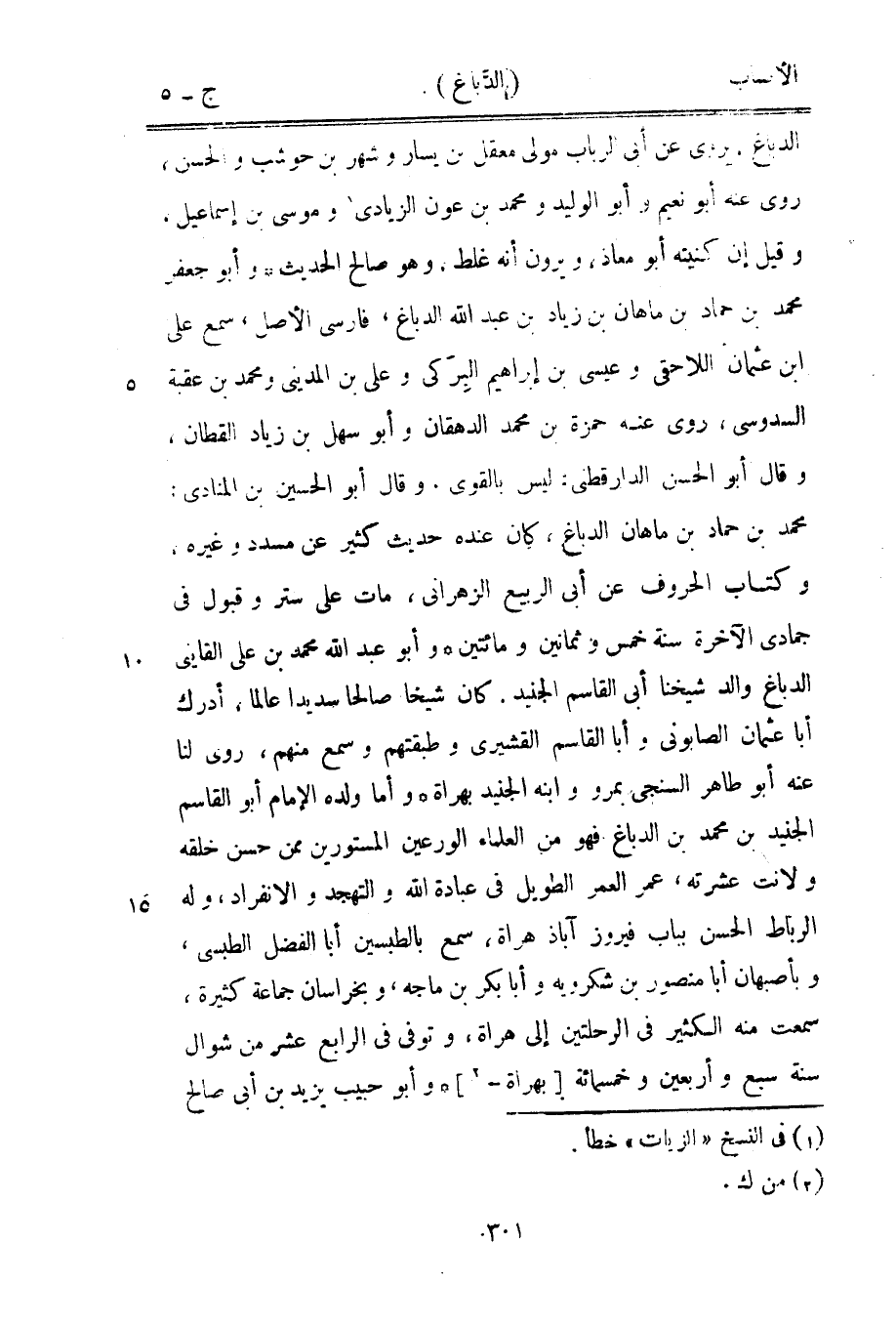 محمد بن حماد بن ماهان الدباغ، كان عنده حديث كثير عن مسدد وغيره، وكتاب الحروف عن أبى الربيع الزهراني، مات على ستر وقبول في جمادى الآخرة سنة خمس وثمانين ومائتين وأبو عبد الله محمد بن على القائني الدباغ والد شيخنا أبى القاسم الجنيد، كان شيخا صالحا سديدا عالما، أدرك أبا عثمان الصابوني وأبا القاسم القشيري وطبقتهم وسمع منهم، روى لنا عنه أبو طاهر السنجى بمرو وابنه الجنيد بهراة وأما ولده الإمام أبو القاسم الجنيد بن محمد بن الدباغ فهو من العلماء الورعين المستورين ممن حسن خلقه ولانت عشرته، عمر العمر الطويل في عبادة الله والتهجد والانفراد، وله الرباط الحسن بباب فيروزآباد هراة، سمع بالطبسين أبا الفضل الطبسي، وبأصبهان أبا منصور بن شكرويه وأبا بكر بن ماجة، وبخراسان جماعة كثيرة، سمعت منه الكثير في الرحلتين إلى هراة، وتوفى في الرابع عشر من شوال سنة سبع وأربعين وخمسمائة [بهراة-[2]] وأبو حبيب يزيد بن أبى صالح