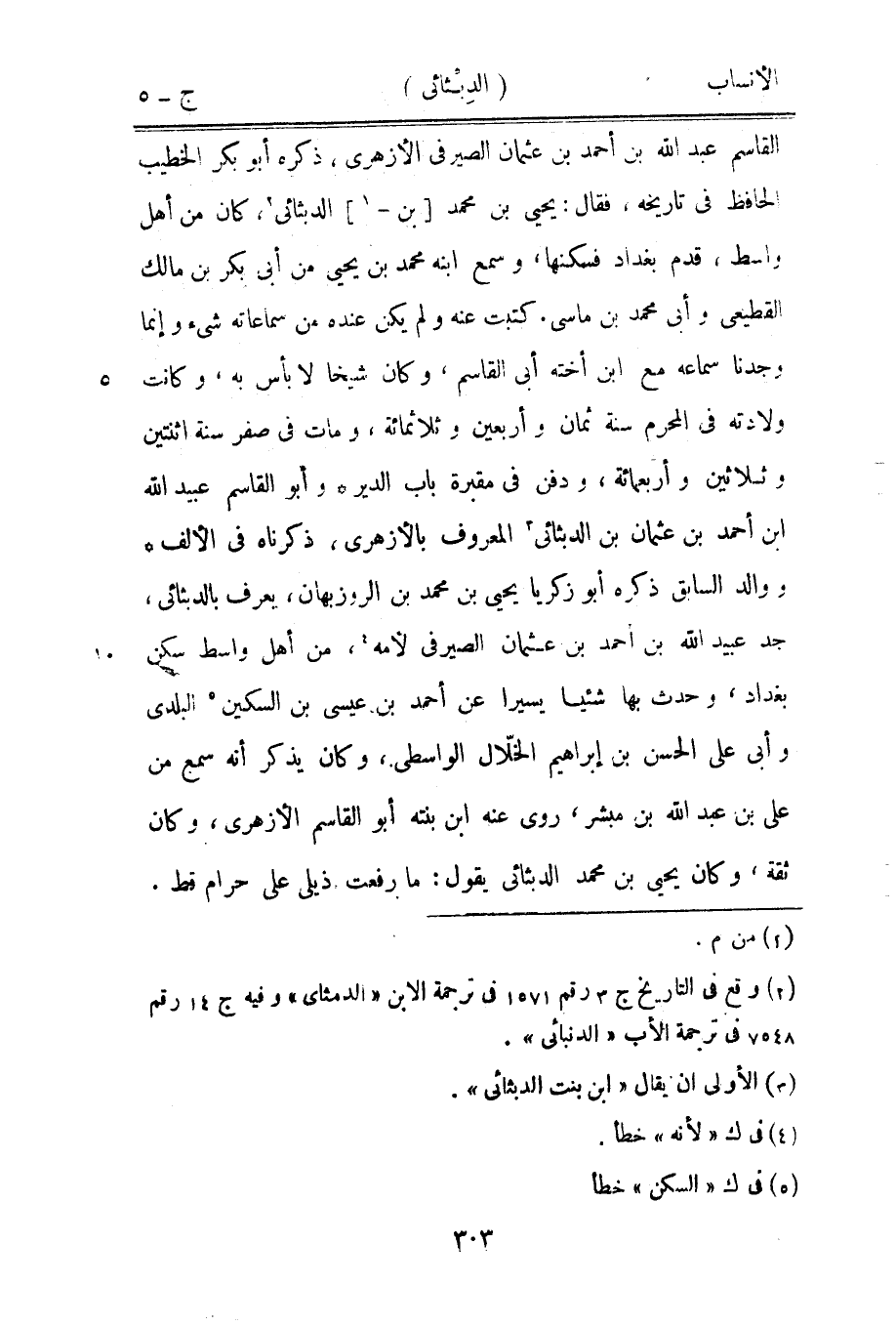 القاسم عبد الله بن أحمد بن عثمان الصيرفي الأزهري، ذكره أبو بكر الخطيب الحافظ في تاريخه، فقال: يحيى بن محمد [بن-[1]] الدبثائى [2] ، كان من أهل واسط، قدم بغداد فسكنها، وسمع ابنه محمد بن يحيى من أبى بكر بن مالك القطيعي وأبى محمد بن ماسى. كتبت عنه ولم يكن عنده من سماعاته شيء وإنما وجدنا سماعه مع ابن أخته أبى القاسم، وكان شيخا لا بأس به، وكانت ولادته في المحرم سنة ثمان وأربعين وثلاثمائة، ومات في صفر سنة اثنتين وثلاثين وأربعمائة، ودفن في مقبرة باب الدير وأبو القاسم عبيد الله ابن أحمد بن عثمان بن الدبثائى [3] المعروف بالأزهري، ذكرناه في الألف ووالد السابق ذكره أبو زكريا يحيى بن محمد بن الروزبهان، يعرف بالدبثائي، جد عبيد الله بن أحمد بن عثمان الصيرفي لأمه [4] ، من أهل واسط سكن بغداد، وحدث بها شيئا يسيرا عن أحمد بن عيسى بن السكين [5] البلدي وأبى على الحسن بن إبراهيم الخلّال الواسطي، وكان يذكر أنه سمع من على بن عبد الله بن مبشر، روى عنه ابن بنته أبو القاسم الأزهري، وكان ثقة، وكان يحيى بن محمد الدبثائى يقول: ما رفعت ذيلي على حرام قط.