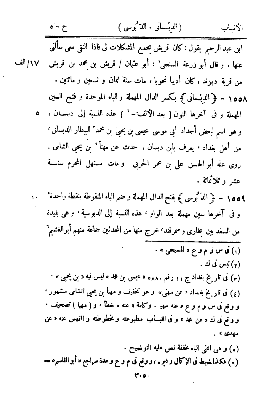 بفتح الدال المهملة وضم الباء المنقوطة بنقطة واحدة [5] وفي آخرها سين مهملة بعد الواو، هذه النسبة إلى الدبوسية، وهي بليدة من السغد بين بخارى وسمرقند، خرج منها من المحدثين جماعة منهم أبو الغشيم [6]