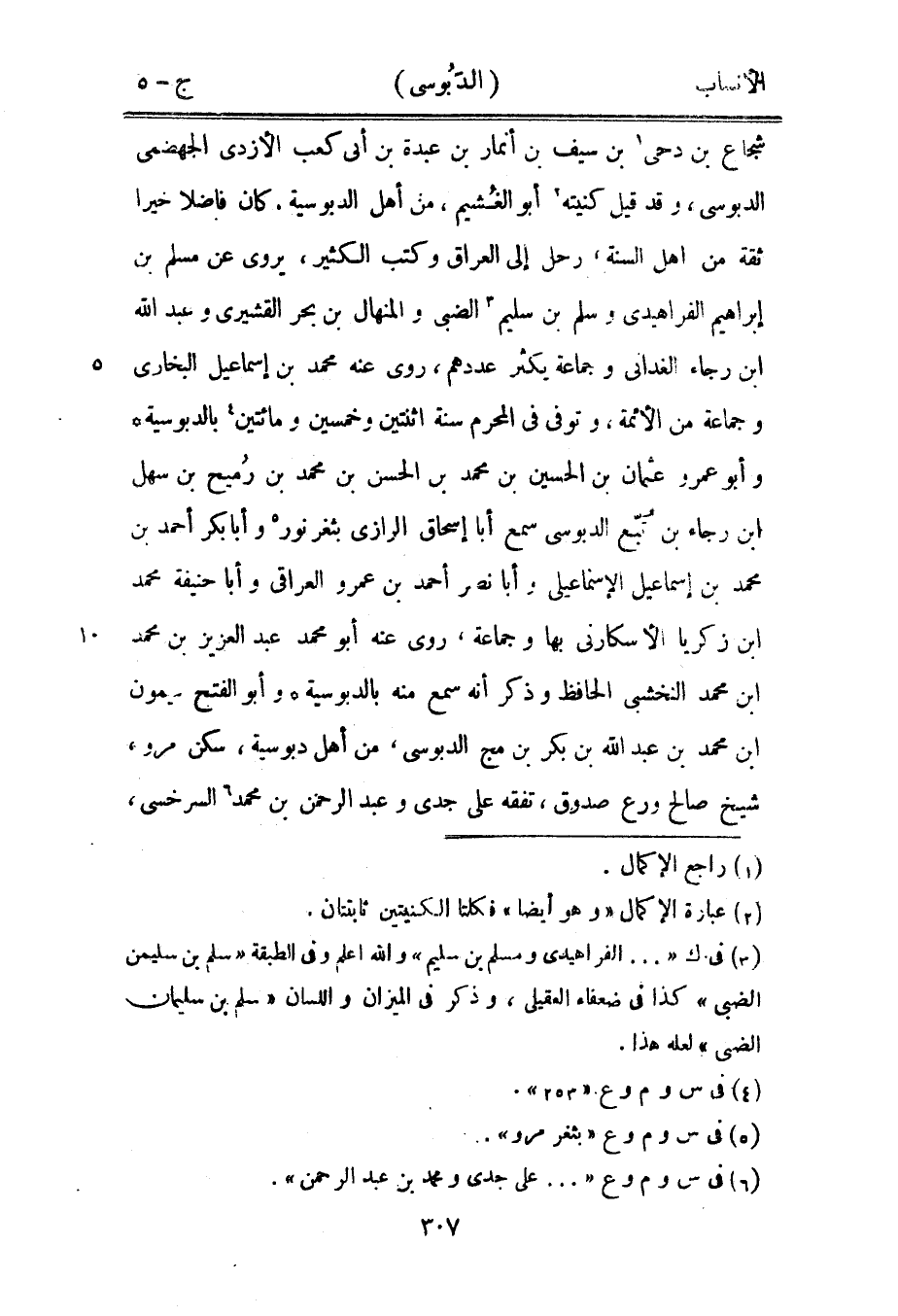 شجاع بن دحى [1] بن سيف بن أنمار بن عبدة بن أبى كعب الأزدي الجهضمي الدبوسي، وقد قيل كنيته [2] أبو الغشيم، من أهل الدبوسية، كان فاضلا خيرا ثقة من أهل السنة، رحل إلى العراق وكتب الكثير، يروى عن مسلم بن إبراهيم الفراهيدى وسلم بن سليم [3] الضبيّ والمنهال بن بحر القشيري وعبد الله ابن رجاء الغداني وجماعة يكثر عددهم، روى عنه محمد بن إسماعيل البخاري وجماعة من الأئمة، وتوفى في المحرم سنة اثنتين وخمسين ومائتين [4] بالدبوسية وأبو عمرو عثمان بن الحسين بن محمد بن الحسن بن محمد بن رميح بن سهل ابن رجاء بن تبّع الدبوسي سمع أبا إسحاق الرازيّ بثغر نور [5] وأبا بكر أحمد بن محمد بن إسماعيل الإسماعيلي وأبا نصر أحمد بن عمرو العراقي وأبا حنيفة محمد ابن زكريا الإسكارني بها وجماعة، روى عنه أبو محمد عبد العزيز بن محمد ابن محمد النخشبى الحافظ وذكر أنه سمع منه بالدبوسية وأبو الفتح ميمون ابن محمد بن عبد الله بن بكر بن مج الدبوسي، من أهل دبوسية، سكن مرو، شيخ صالح ورع صدوق، تفقه على جدي وعبد الرحمن بن محمد [6] السرخسي،