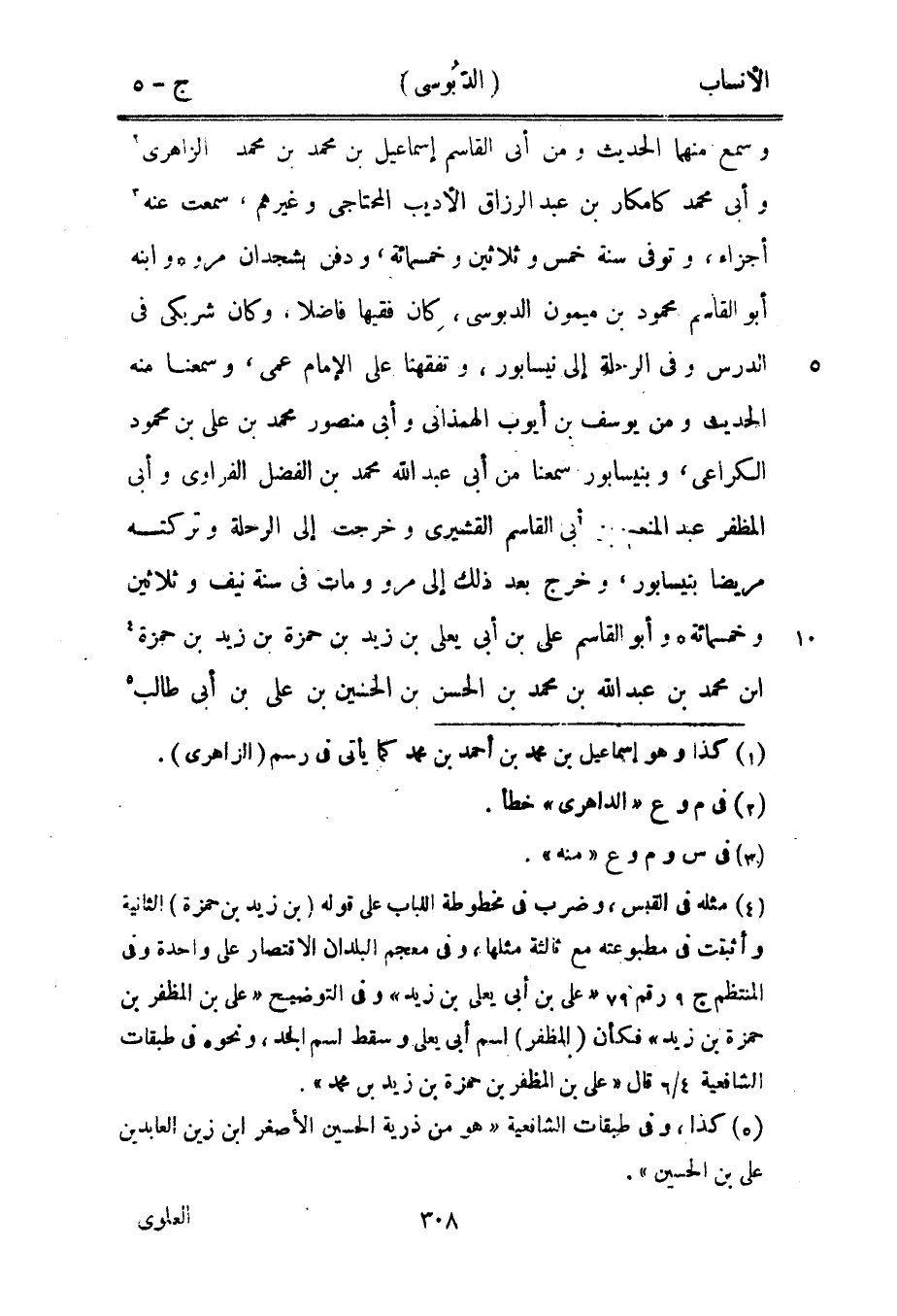 [4] مثله في القبس، وضرب في مخطوطة اللباب على قوله (بن زيد بن حمزة) الثانية وأثبتت في مطبوعته مع ثالثة مثلها، وفي معجم البلدان الاقتصار على واحدة وفي المنتظم ج 9 رقم 79 «على بن أبى يعلى بن زيد» وفي التوضيح «على بن المظفر بن حمزة بن زيد» فكأن (المظفر) اسم أبى يعلى وسقط اسم الجد، ونحوه في طبقات الشافعية 4/ 6 قال «على بن المظفر بن حمزة بن زيد بن محمد» .