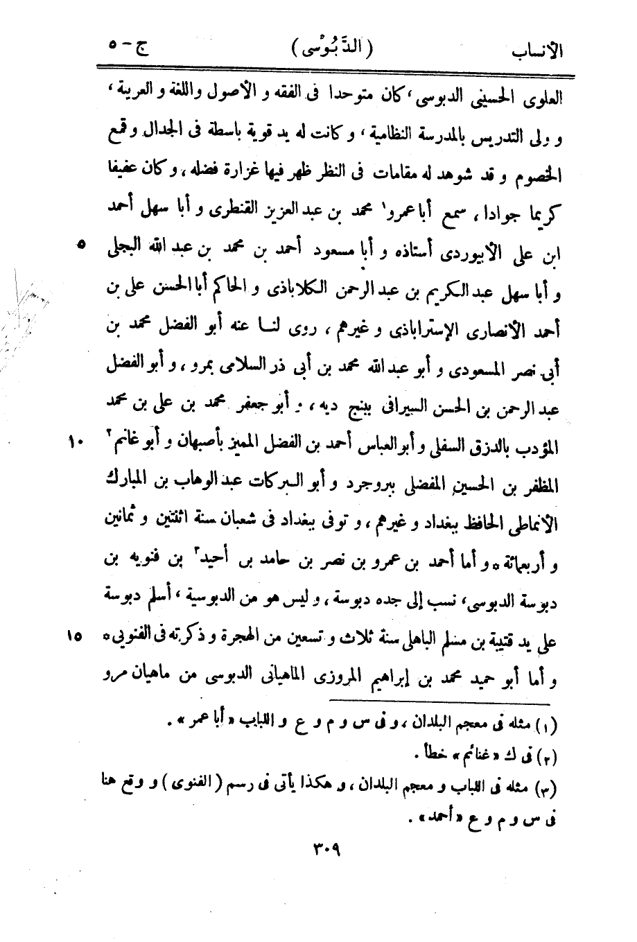العلويّ الحسيني الدبوسي، كان متوحدا في الفقه والأصول واللغة والعربية، وولى التدريس بالمدرسة النظامية، وكانت له يد قوية باسطة في الجدال وقمع الخصوم وقد شوهد له مقامات في النظر ظهر فيها غزارة فضله، وكان عفيفا كريما جوادا، سمع أبا عمرو [1] محمد بن عبد العزيز القنطري وأبا سهل أحمد ابن على الأبيوردي أستاذه وأبا مسعود أحمد بن محمد بن عبد الله البجلي وأبا سهل عبد الكريم بن عبد الرحمن الكلاباذي والحاكم أبا الحسن على بن أحمد الأنصاري الأستراباذي وغيرهم، روى لنا عنه أبو الفضل محمد بن أبى نصر المسعودي وأبو عبد الله محمد بن أبى ذر السلامي بمرو، وأبو الفضل عبد الرحمن بن الحسن السيرافي ببنج ديه، وأبو جعفر محمد بن على بن محمد المؤدب بالدزق السفلى وأبو العباس أحمد بن الفضل المميز بأصبهان وأبو غانم [2] المظفر بن الحسين المفضلى ببروجرد وأبو البركات عبد الوهاب بن المبارك الأنماطي الحافظ ببغداد وغيرهم، وتوفى ببغداد في شعبان سنة اثنتين وثمانين وأربعمائة وأما أحمد بن عمرو بن نصر بن حامد بن أحيد [3] بن فنويه بن دبوسة الدبوسي، نسب إلى جده دبوسة، وليس هو من الدبوسية، أسلم دبوسة على يد قتيبة بن مسلم الباهلي سنة ثلاث وتسعين من الهجرة وذكرته في الفنويى وأما أبو حميد محمد بن إبراهيم المروزي الماهياني الدبوسي من ماهيان مرو