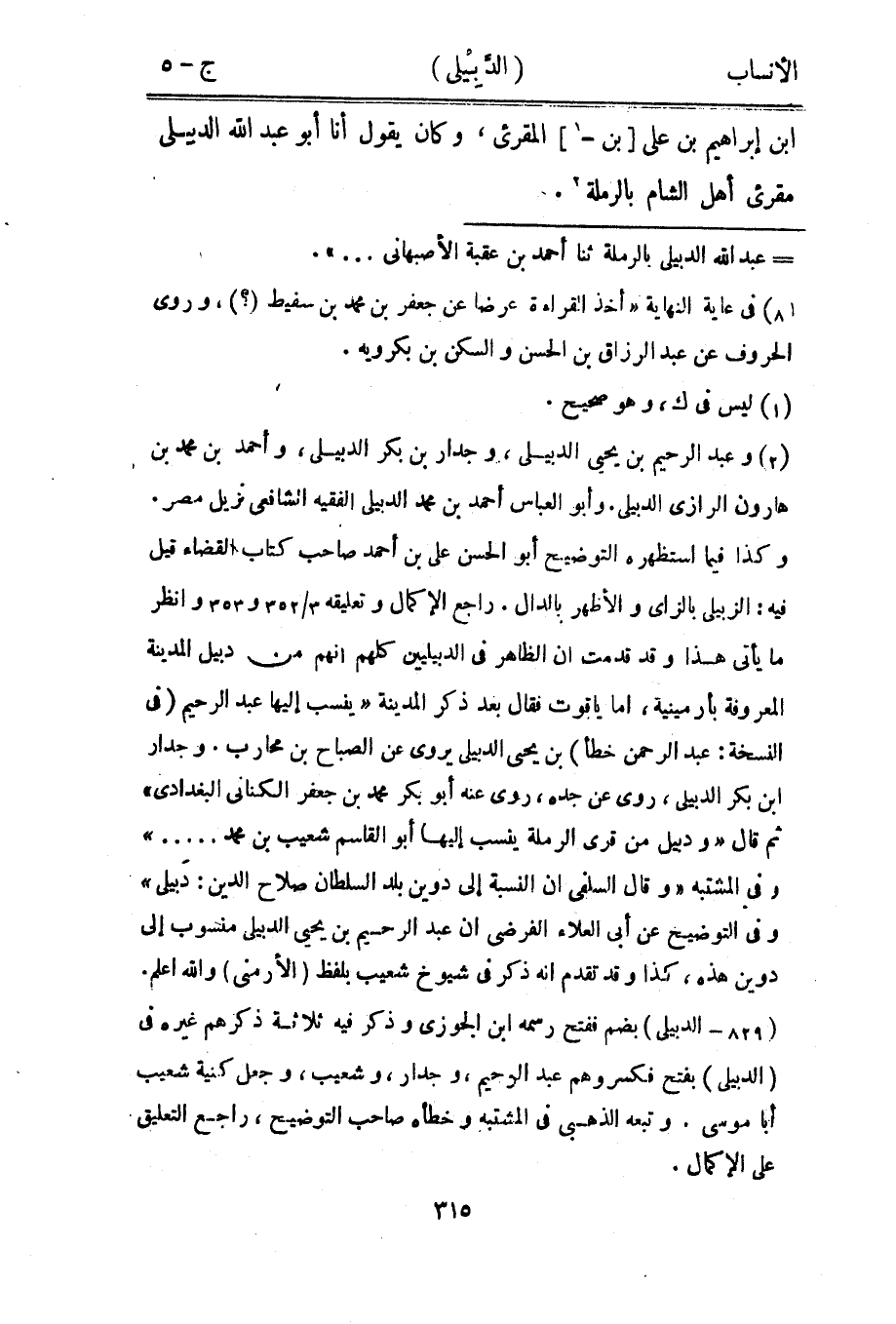 وكذا فيما استظهره التوضيح أبو الحسن على بن أحمد صاحب كتاب القضاء قيل فيه: الزبيلى بالزاي والأظهر بالدال، راجع الإكمال وتعليقه 3/ 352 و 353 وانظر ما يأتى هذا وقد قدمت ان الظاهر في الدبيليين كلهم انهم من دبيل المدينة المعروفة بأرمينية، اما ياقوت فقال بعد ذكر المدينة «ينسب إليها عبد الرحيم (في النسخة: عبد الرحمن خطأ) بن يحيى الدبيلي يروى عن الصباح بن محارب. وجدار ابن بكر الدبيلي، روى عن جده، روى عنه أبو بكر محمد بن جعفر الكناني البغدادي» ثم قال «ودبيل من قرى الرملة ينسب إليها أبو القاسم شعيب بن محمد....» وفي المشتبه «وقال السلفي ان النسبة إلى دوين بلد السلطان صلاح الدين: دبيلي» وفي التوضيح عن أبى العلاء الفرضيّ ان عبد الرحيم بن يحيى الدبيلي منسوب إلى ديون هذه، كذا وقد تقدم انه ذكر في شيوخ شعيب بلفظ (الأرمني) والله اعلم.