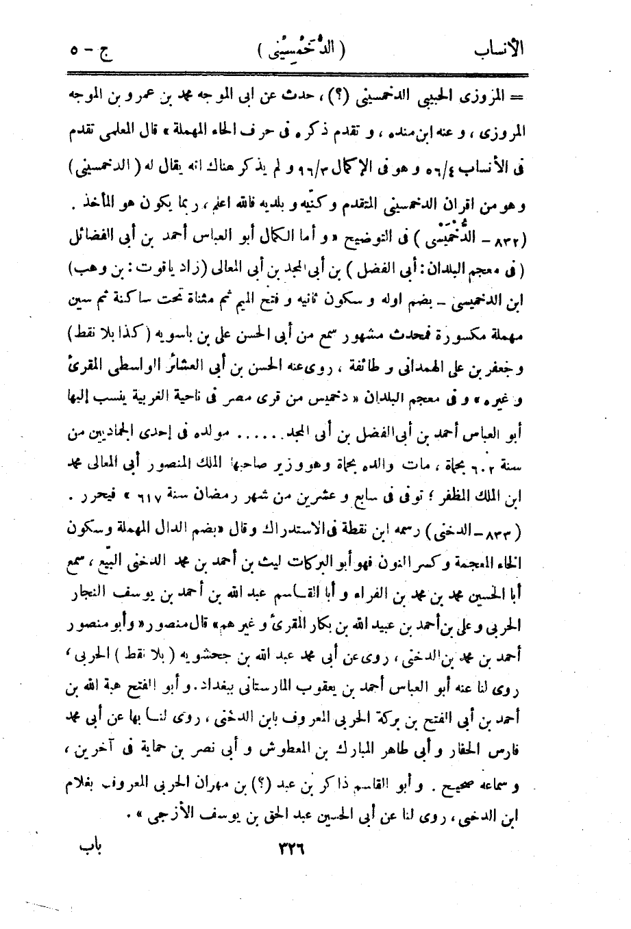 [ () ] المزوزى الحبيبى الدخمسينى (؟) ، حدث عن ابى الموجه محمد بن عمرو بن الموجه المروزي، وعنه ابن مندة، وتقدم ذكره في حرف الحاء المهملة» قال المعلمي تقدم في الأنساب 4/ 56 وهو في الإكمال 3/ 96 ولم يذكر هناك انه يقال له (الدخمسينى) وهو من إقران الدخمسينى المتقدم وكنيه وبلديه فاللَّه اعلم، ربما يكون هو المأخذ.