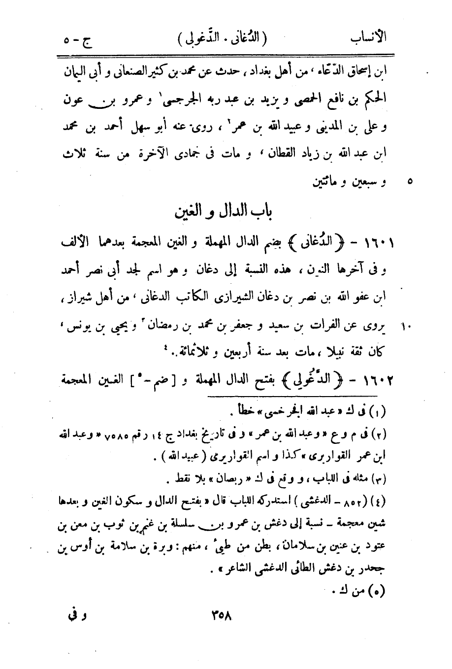 [4] (852- الدغشي) استدركه اللباب قال «بفتح الدال وسكون الغين وبعدها شين معجمة- نسبة إلى دغش بن عمرو بن سلسلة بن غنم بن ثوب بن معن بن عتود بن عنين بن سلامان، بطن من طيِّئ، منهم: وبرة بن سلامة بن أوس بن جحدر بن دغش الطائي الدغشي الشاعر» .