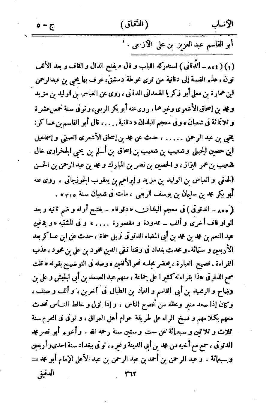 [1] (854- الدّقانى) استدركه اللباب وقال «بفتح الدال والقاف وبعد الألف نون، هذه النسبة إلى دقانية من قرى غوطة دمشق، عرف بها يحيى بن عبد الرحمن ابن عمارة بن معلى أبو زكريا الهمدانيّ الدقانى، روى عن العباس بن الوليد بن مزيد ومحمد بن إسحاق الأشعري وغيرهما، روى عنه أبو بكر الربعي، وتوفى سنة خمس عشرة وثلاثمائة في شعبان» وفي معجم البلدان «دقانية....، قال أبو القاسم بن عساكر: