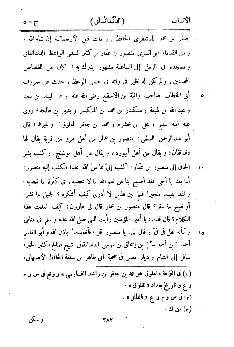 جعفر بن محمد لمستغفرى الحافظ، ومات قبل الأربعمائة إن شاء الله ومن القدماء أبو السري منصور بن عمّار بن كثير السلمي الواعظ الدندانقانى ومسجده في الرمل إلى الساعة مشهور يتبرك به، كان من القصاص المحسنين، ولم يكن له نظير في وقته في حسن الوعظ، حدث عن معروف أبى الخطاب صاحب واثلة بن الأسقع رضى الله عنه وعن ليث بن سعد وعبد الله بن لهيعة ومنكدر بن محمد بن المنكدر وبشير بن طلحة، روى عنه ابنه سليم وعلى بن خشرم ومحمد بن جعفر لعلوق [1] وغيرهم، قال أبو عبد الرحمن السلمي: منصور بن عمار من أهل مرو من قرية يقال لها دندانقان، ويقال من أهل أبيورد، ويقال من أهل بوشنج. وكتب بشر الحافى إلى منصور بن عمّار: اكتب إليّ بما من الله علينا فكتب إليه منصور: