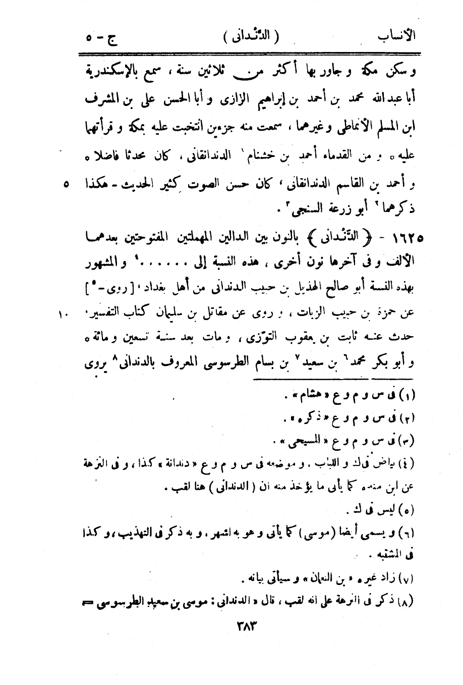 بالنون بين الدالين المهملتين المفتوحتين بعدهما الألف وفي آخرها نون أخرى، هذه النسبة إلى..... [4] والمشهور بهذه النسبة أبو صالح الهذيل بن حبيب الدندانى من أهل بغداد، [روى-[5]] عن حمزة بن حبيب الزيات، وروى عن مقاتل بن سليمان كتاب التفسير، حدث عنه ثابت بن يعقوب التوّزي، ومات بعد سنة تسعين ومائة وأبو بكر محمد [6] بن سعيد [7] بن بسام الطرسوسي المعروف بالدندانى [8] يروى