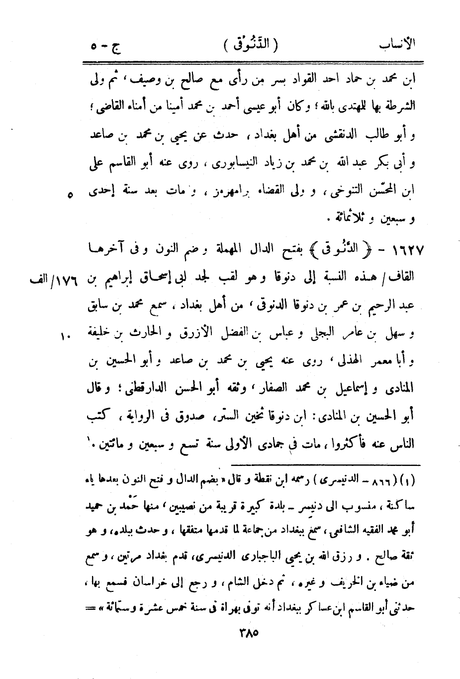 [1] (866- الدنيسريّ) رسمه ابن نقطة وقال «بضم الدال وفتح النون بعدها ياء ساكنة، منسوب الى دنيسر- بلدة كبيرة قريبة من نصيبين، منها حمد بن حميد أبو محمد الفقيه الشافعيّ، سمع ببغداد من جماعة لما قدمها متفقها، وحدث ببلده، وهو ثقة صالح. ورزق الله بن يحيى الباجبارى الدنيسريّ، قدم بغداد مرتين، وسمع من ضياء بن الخريف وغيره، ثم دخل الشام، ورجع إلى خراسان فسمع بها، حدثني أبو القاسم ابن عساكر ببغداد أنه توفى بهراة في سنة خمس عشرة وستمائة»