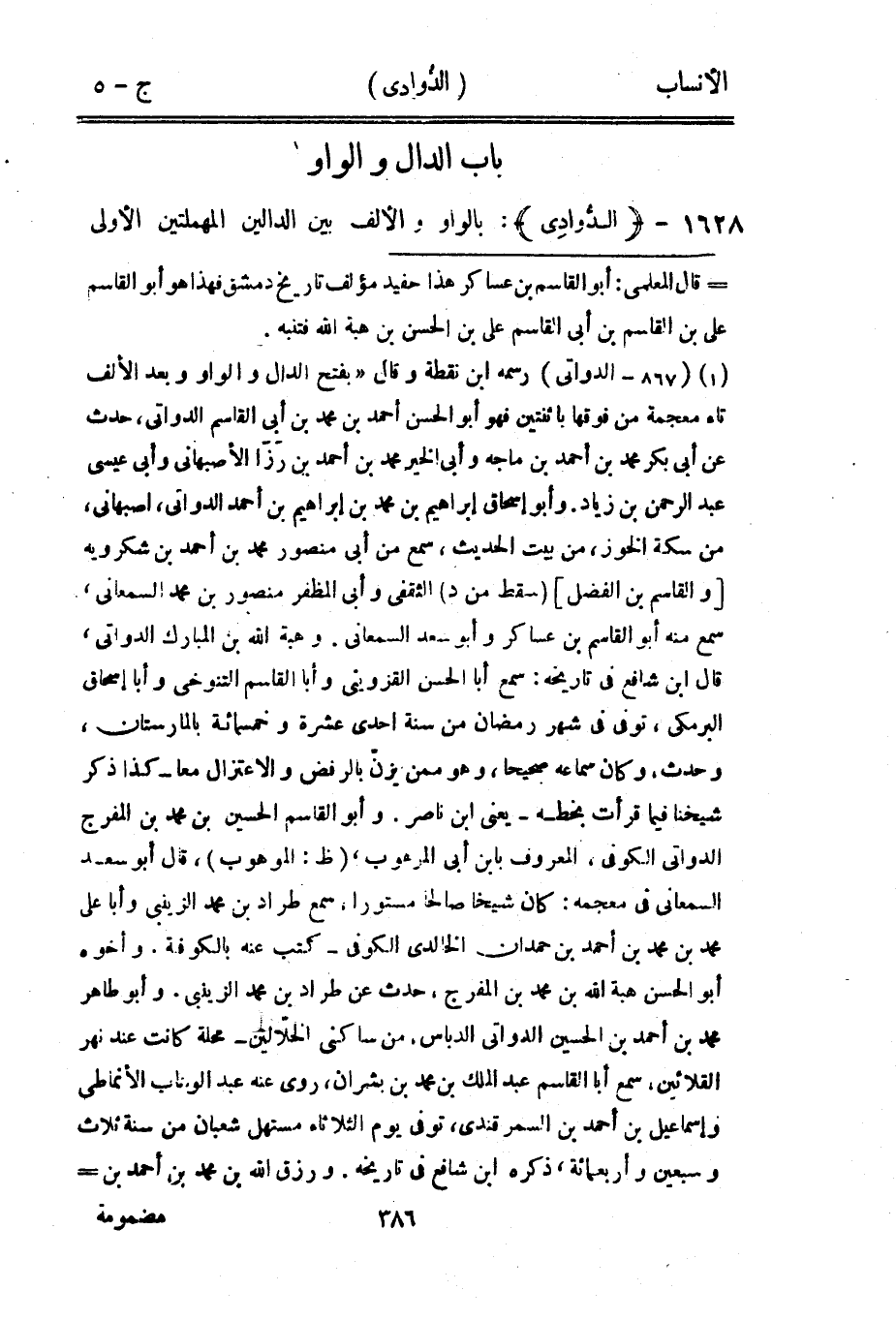 [1] (867- الدواتى) رسمه ابن نقطة وقال «بفتح الدال والواو وبعد الألف تاء معجمة من فوقها باثنتين فهو أبو الحسن أحمد بن محمد بن أبى القاسم الدواتى، حدث عن أبى بكر محمد بن أحمد بن ماجة وأبى الخير محمد بن ررا الأصبهاني وأبى عيسى عبد الرحمن بن زياد. وأبو إسحاق إبراهيم بن محمد بن إبراهيم بن أحمد الدواتى، أصبهاني، من سكة الخوز، من بيت الحديث، سمع من أبى منصور محمد بن أحمد بن شكرويه [والقاسم بن الفضل] (سقط من د) الثقفي وأبى المظفر منصور بن محمد السمعاني، سمع منه أبو القاسم بن عساكر وأبو سعد السمعاني. وهبة الله بن المبارك الدواتى، قال ابن شافع في تاريخه: سمع أبا الحسن القزويني وأبا القاسم التنوخي وأبا إسحاق البرمكي، توفى في شهر رمضان من سنة احدى عشرة وخمسمائة بالمارستان، وحدث، وكان سماعه صحيحا، وهو ممن يزنّ بالرفض والاعتزال معا- كذا ذكر شيخنا فيما قرأت بخطه- يعنى ابن ناصر. وأبو القاسم الحسين بن محمد بن المفرج الدواتى الكوفي، المعروف بابن أبى المرهوب، (ظ: الموهوب) ، قال أبو سعد السمعاني في معجمه: كان شيخا صالحا مستورا، سمع طراد بن محمد الزينبي وأبا على محمد بن محمد بن أحمد بن حمدان الخالديّ الكوفي- كتب عنه بالكوفة. وأخوه أبو الحسن هبة الله بن محمد بن المفرج، حدث عن طراد بن محمد الزينبي. وأبو طاهر محمد بن أحمد بن الحسين الدواتى الدباس، من ساكني الخلّالين- محلة كانت عند نهر القلائين، سمع أبا القاسم عبد الملك بن محمد بن بشران، روى عنه عبد الوهاب الأنماطي وإسماعيل بن أحمد بن السمرقندي، توفى يوم الثلاثاء مستهل شعبان من سنة ثلاث وسبعين وأربعمائة، ذكره ابن شافع في تاريخه. ورزق الله بن محمد بن أحمد بن