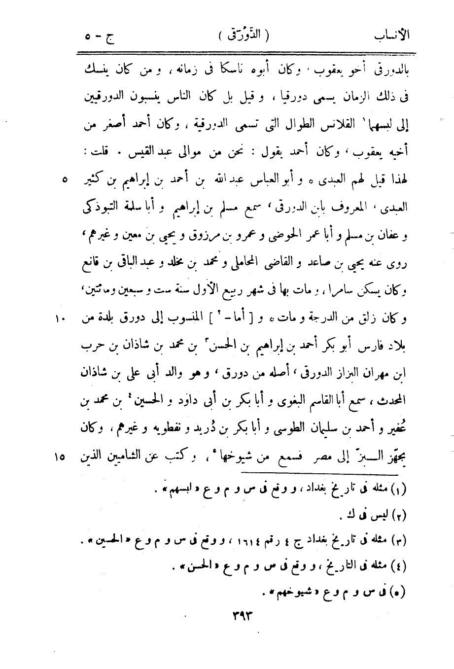 لهذا قيل لهم العبديّ وأبو العباس عبد الله بن أحمد بن إبراهيم بن كثير العبديّ، المعروف بابن الدورقي، سمع مسلم بن إبراهيم، وأبا سلمة التبوذكي وعفان بن مسلم وأبا عمر الحوضيّ وعمرو بن مرزوق ويحيى بن معين وغيرهم، روى عنه يحيى بن صاعد والقاضي المحاملي ومحمد بن مخلد وعبد الباقي بن قانع وكان يسكن سامرا، ومات بها في شهر ربيع الأول سنة ست وسبعين ومائتين، وكان زلق من الدرجة ومات و [أما-[2]] المنسوب إلى دورق بلدة من بلاد فارس أبو بكر أحمد بن إبراهيم بن الحسن [3] بن محمد بن شاذان بن حرب ابن مهران البزاز الدورقي، أصله من دورق، وهو والد أبى على بن شاذان المحدث، سمع أبا القاسم البغوي وأبا بكر بن أبى داود والحسين [4] بن محمد بن عفير وأحمد بن سليمان الطوسي وأبا بكر بن دريد ونفطويه وغيرهم، وكان يجهّز البزّ إلى مصر فسمع من شيوخها [5] ، وكتب عن الشاميين الذين