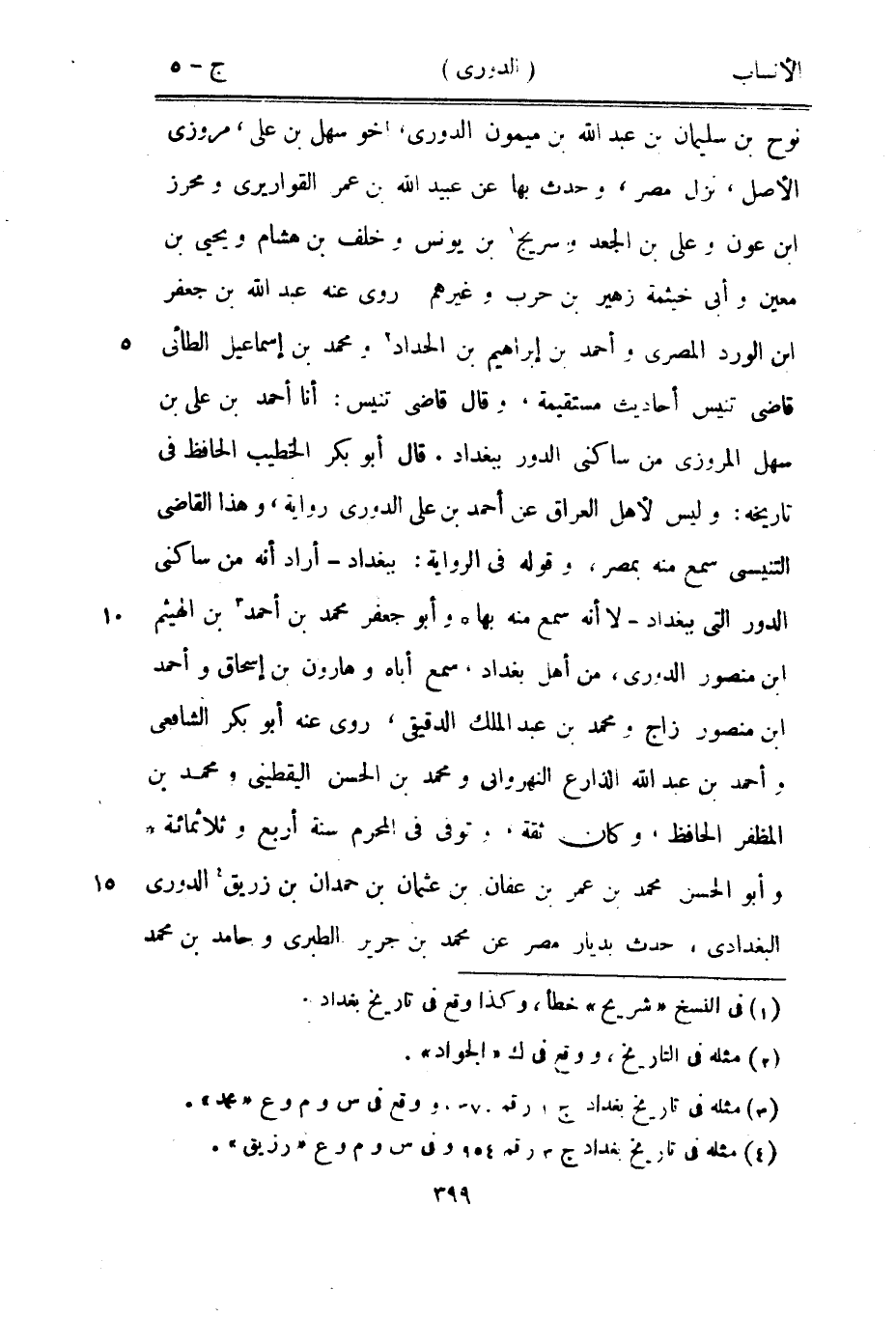 نوح بن سليمان بن عبد الله بن ميمون الدوري، أخو سهل بن على، مروزى الأصل، نزل مصر، وحدث بها عن عبيد الله بن عمر القواريري ومحرز ابن عون وعلى بن الجعد وسريج [1] بن يونس وخلف بن هشام ويحيى بن معين وأبى خيثمة زهير بن حرب وغيرهم روى عنه عبد الله بن جعفر ابن الورد المصري وأحمد بن إبراهيم بن الحداد [2] ومحمد بن إسماعيل الطائي قاضى تنيس أحاديث مستقيمة، وقال قاضى تنيس: أنا أحمد بن على بن سهل المروزي من ساكني الدور ببغداد. قال أبو بكر الخطيب الحافظ في تاريخه: وليس لأهل العراق عن أحمد بن على الدوري رواية، وهذا القاضي التنيسي سمع منه بمصر، وقوله في الرواية: ببغداد- أراد أنه من ساكني الدور التي ببغداد- لا أنه سمع منه بها وأبو جعفر محمد بن أحمد [3] بن الهيثم ابن منصور الدوري، من أهل بغداد، سمع أباه وهارون بن إسحاق وأحمد ابن منصور زاج ومحمد بن عبد الملك الدقيقي، روى عنه أبو بكر الشافعيّ وأحمد بن عبد الله الذارع النهرواني ومحمد بن الحسن اليقطيني ومحمد بن المظفر الحافظ، وكان ثقة، وتوفى في المحرم سنة أربع وثلاثمائة وأبو الحسن محمد بن عمر بن عفان بن عثمان بن حمدان بن زريق [4] الدوري البغدادي، حدث بديار مصر عن محمد بن جرير الطبري وحامد بن محمد