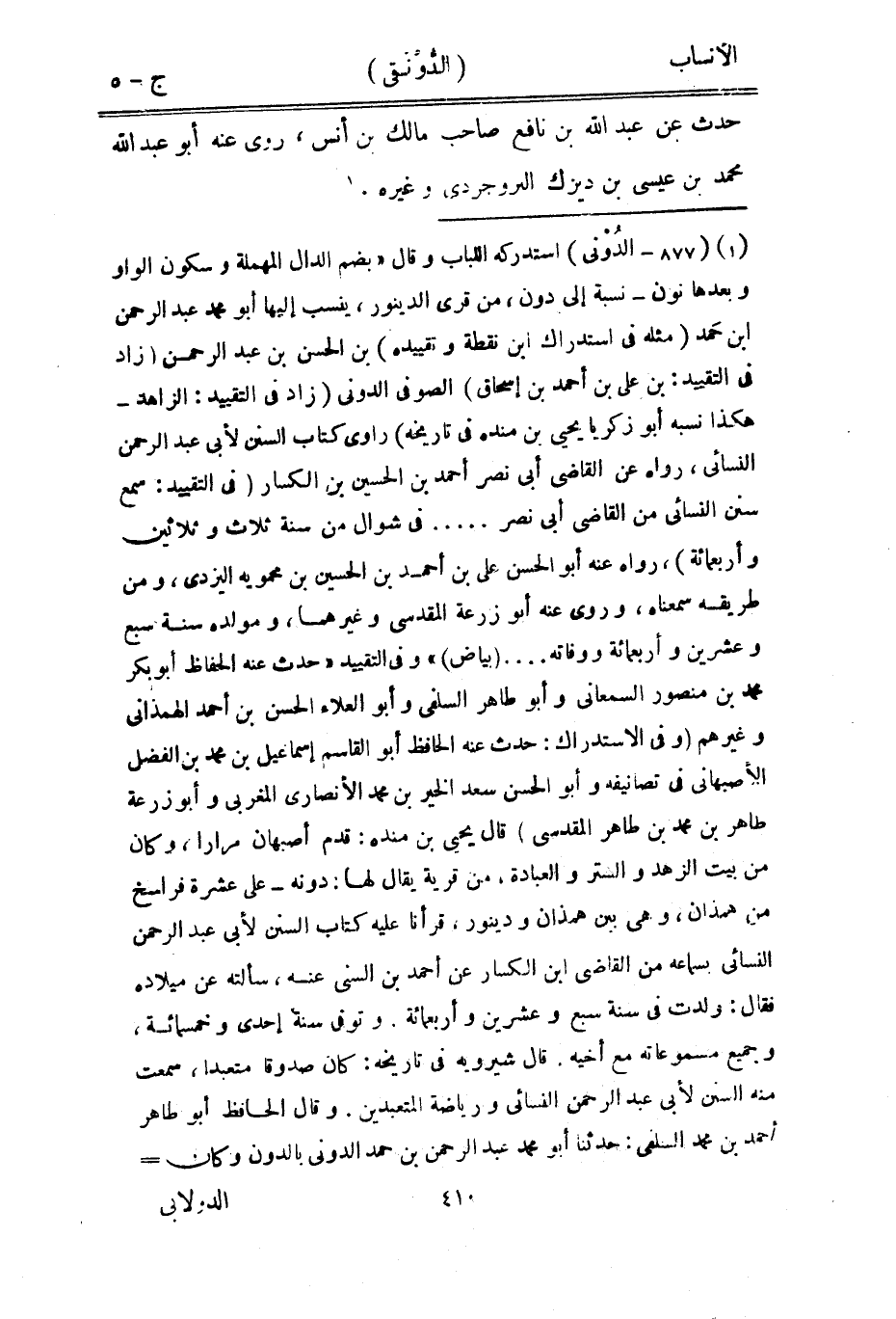 [1] (877- الدونى) استدركه اللباب وقال «بضم الدال المهملة وسكون الواو وبعدها نون- نسبة إلى دون، من قرى الدينور، ينسب إليها أبو محمد عبد الرحمن ابن حمد (مثله في استدراك ابن نقطة وتقييده) بن الحسن بن عبد الرحمن (زاد في التقييد: بن على بن أحمد بن إسحاق) الصوفي الدونى (زاد في التقييد: الزاهد- هكذا نسبه أبو زكريا يحيى بن مندة في تاريخه) راوي كتاب السنن لأبى عبد الرحمن النسائي، رواه عن القاضي أبى نصر أحمد بن الحسين بن الكسار (في التقييد: سمع سنن النسائي من القاضي أبى نصر..... في شوال من سنة ثلاث وثلاثين وأربعمائة) ، رواه عنه أبو الحسن على بن أحمد بن الحسين بن محمويه اليزدي، ومن طريقه سمعناه، وروى عنه أبو زرعة المقدسي وغيرهما، ومولده سنة سبع وعشرين وأربعمائة ووفاته.... (بياض) » وفي التقييد «حدث عنه الحفاظ أبو بكر محمد بن منصور السمعاني وأبو طاهر السلفي وأبو العلاء الحسن بن أحمد الهمذانيّ وغيرهم (وفي الاستدراك: حدث عنه الحافظ أبو القاسم إسماعيل بن محمد بن الفضل الأصبهاني في تصانيفه وأبو الحسن سعد الخير بن محمد الأنصاري المغربي وأبو زرعة طاهر بن محمد بن طاهر المقدسي) قال يحيى بن مندة: قدم أصبهان مرارا، وكان من بيت الزهد والستر والعبادة، من قرية يقال لها: دونه- على عشرة فراسخ من همذان، وهي بين همذان ودينور، قرأنا عليه كتاب السنن لأبى عبد الرحمن النسائي بسماعه من القاضي ابن الكسار عن أحمد بن السنى عنه، سألته عن ميلاده فقال: ولدت في سنة سبع وعشرين وأربعمائة. وتوفى سنة إحدى وخمسمائة، وجميع مسموعاته مع أخيه. قال شيرويه في تاريخه: كان صدوقا متعبدا، سمعت منه السنن لأبى عبد الرحمن النسائي ورياضة المتعبدين. وقال الحافظ أبو طاهر أحمد بن محمد السلفي: حدثنا أبو محمد عبد الرحمن بن حمد الدونى بالدون وكان