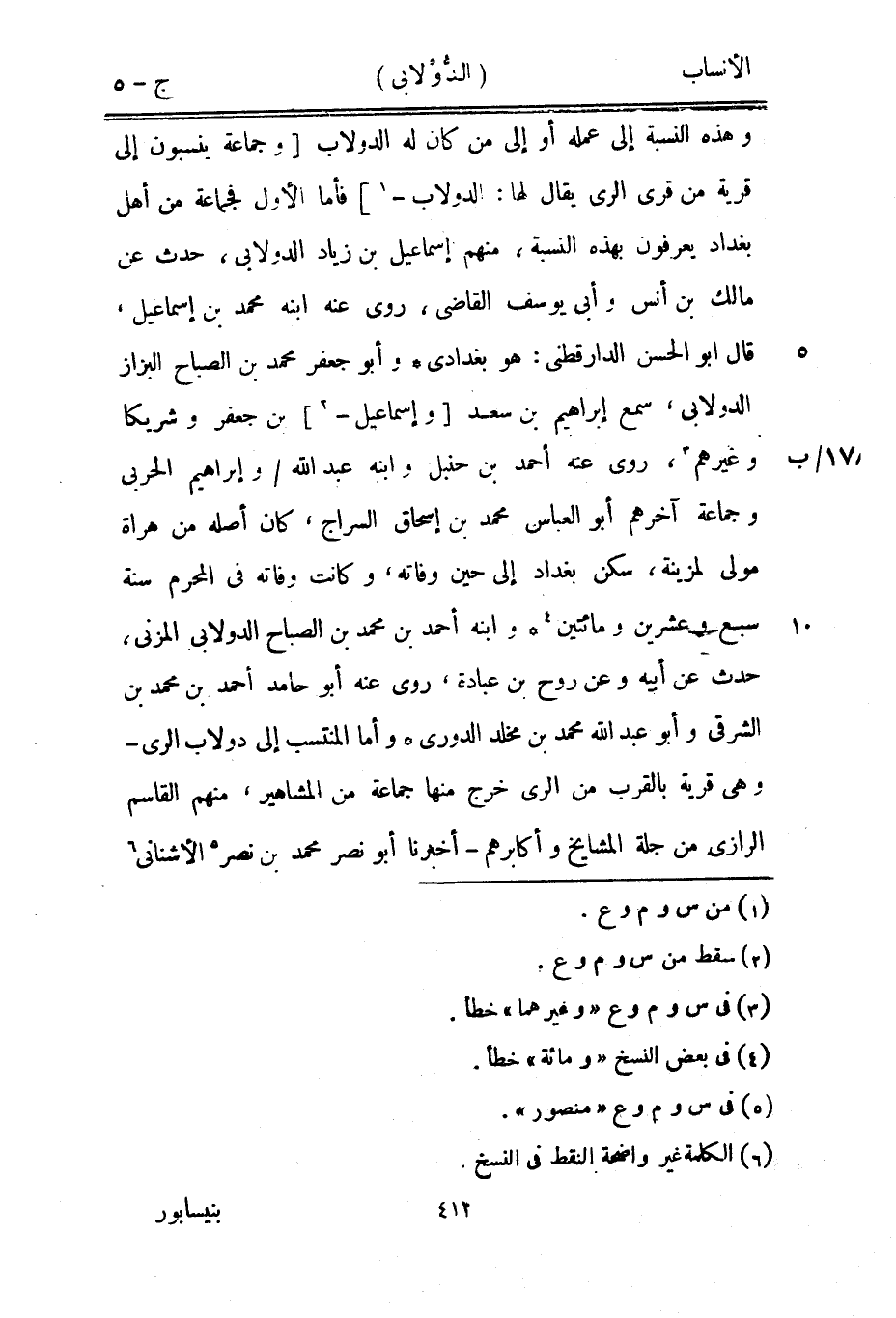 وهذه النسبة إلى عمله أو إلى من كان له الدولاب [وجماعة ينسبون إلى قرية من قرى الري يقال لها: الدولاب-[1]] فأما الأول فجماعة من أهل بغداد يعرفون بهذه النسبة، منهم إسماعيل بن زياد الدولابي، حدث عن مالك بن أنس وأبى يوسف القاضي، روى عنه ابنه محمد بن إسماعيل، قال ابو الحسن الدار قطنى: هو بغدادي وأبو جعفر محمد بن الصباح البزاز الدولابي، سمع إبراهيم بن سعد [وإسماعيل-[2]] بن جعفر وشريكا وغيرهم [3] ، روى عنه أحمد بن حنبل وابنه عبد الله/ وإبراهيم الحربي وجماعة آخرهم أبو العباس محمد بن إسحاق السراج، كان أصله من هراة مولى لمزينة، سكن بغداد إلى حين وفاته، وكانت وفاته في المحرم سنة سبع وعشرين ومائتين [4] وابنه أحمد بن محمد بن الصباح الدولابي المزني، حدث عن أبيه وعن روح بن عبادة، روى عنه أبو حامد أحمد بن محمد بن الشرقي وأبو عبد الله محمد بن مخلد الدوري وأما المنتسب إلى دولاب الري- وهي قرية بالقرب من الري خرج منها جماعة من المشاهير، منهم القاسم الرازيّ من جلة المشايخ وأكابرهم- أخبرنا أبو نصر محمد بن نصر [5] الأشناني [6]