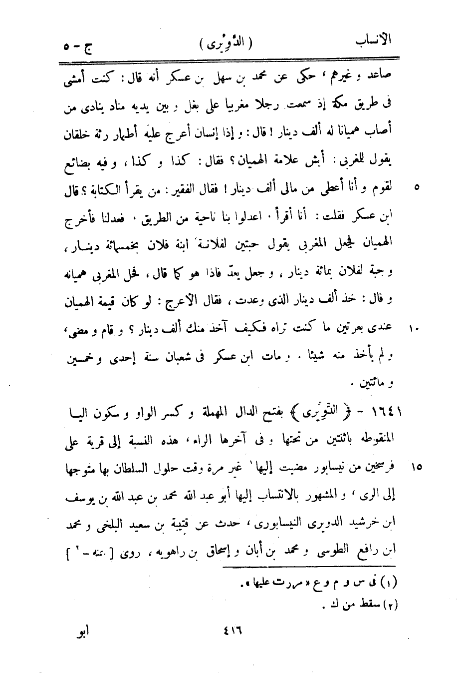بفتح الدال المهملة وكسر الواو وسكون الياء المنقوطة باثنتين من تحتها وفي آخرها الراء، هذه النسبة إلى قرية على فرسخين من نيسابور مضيت إليها [1] غير مرة وقت حلول السلطان بها متوجها إلى الري، والمشهور بالانتساب إليها أبو عبد الله محمد بن عبد الله بن يوسف ابن خرشيد الدويرى النيسابورىّ، حدث عن قتيبة بن سعيد البلخي ومحمد ابن رافع الطوسي ومحمد بن أبان وإسحاق بن راهويه، روى [عنه-[2]]