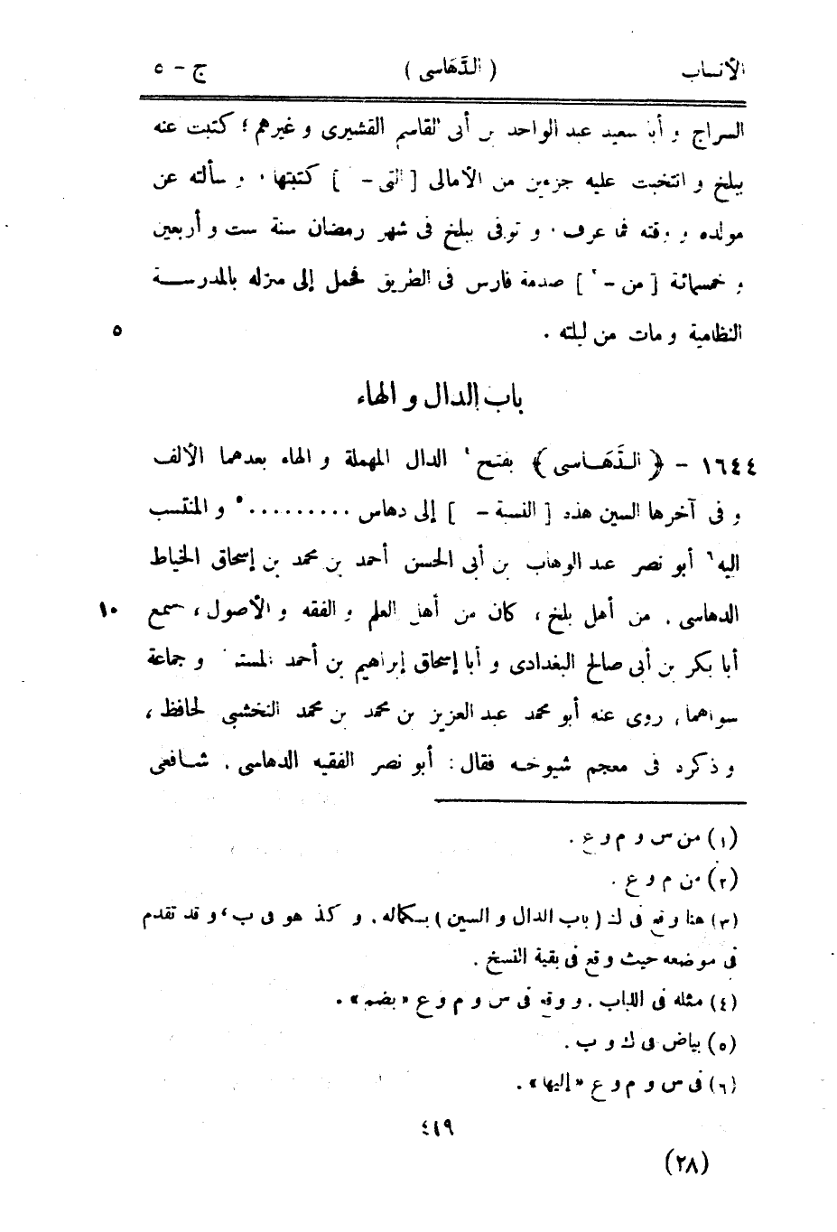 [3] بفتح [4] الدال المهملة والهاء بعدهما الألف وفي آخرها السين هذه [النسبة-] إلى دهاس...... [5] والمنتسب اليه [6] أبو نصر عبد الوهاب بن أبى الحسن أحمد بن محمد بن إسحاق الخياط الدهاسى، من أهل بلخ، كان من أهل العلم والفقه والأصول، سمع أبا بكر بن أبى صالح البغدادي وأبا إسحاق إبراهيم بن أحمد المستملي وجماعة سواهما، روى عنه أبو محمد عبد العزيز بن محمد بن محمد النخشبى الحافظ، وذكره في معجم شيوخه فقال: أبو نصر الفقيه الدهاسى، شافعيّ