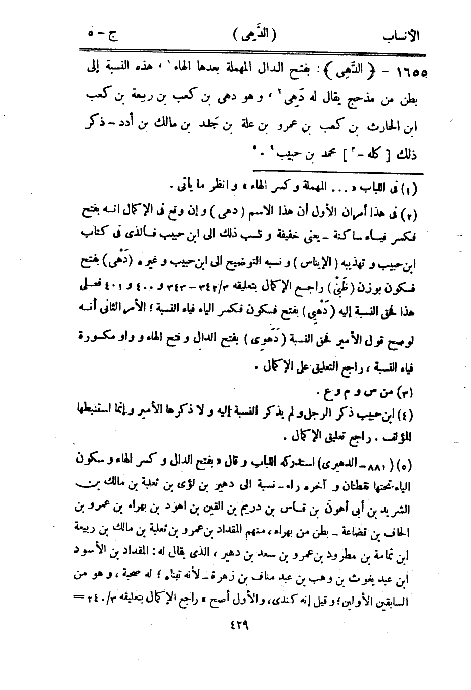 [2] في هذا أمران الأول أن هذا الاسم (دهى) وإن وقع في الإكمال انه بفتح فكسر فياء ساكنة- يعنى خفيفة ونسب ذلك الى ابن حبيب فالذي في كتاب ابن حبيب وتهذيبه (الإيناس) ونسبه التوضيح الى ابن حبيب وغيره (دهى) بفتح فسكون بوزن (ظبى) راجع الإكمال بتعليقه 3/ 342- 343 و 400 و 401 فعلى هذا فحق النسبة إليه (دهيى) بفتح فسكون فكسر الياء فياء النسبة، الأمر الثاني أنه لو صحّ قول الأمير فحق النسبة (دهوى) بفتح الدال وفتح الهاء وواو مكسورة فياء النسبة، راجع التعليق على الإكمال.