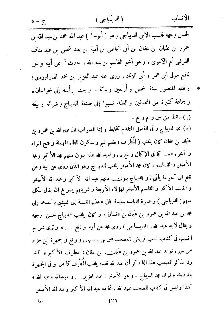 [2] اى الديباج وفي الفصل المتقدم تخليط وإنما الصواب ان عبد الله بن عمرو بن عثمان بن عفان كان يلقب (المطرف) بضم الميم وسكون الطاء المهملة وفتح الراء وآخره فاء- كما في الإكمال وغيره، ولعبد الله هذا بنون منهم محمد الأكبر ومحمد الأصغر والقاسم، كان محمد الأصغر يلقب الديباج وهو الّذي روى عن أبيه وعن نافع الى آخر ما يأتى، وللديباج بنون منهم عبد الله الأكبر وعبد الله الأصغر والقاسم الأكبر والقاسم الأصغر فهؤلاء الأربعة وذريتهم يسوغ ان يقال لكل منهم (الديباجي) وعبارة اللباب سليمة قال «هذه النسبة إلى شيئين، أحدهما إلى محمد بن عبد الله بن عمرو بن عثمان بن عفان، وكان يلقب الديباج لحسن وجهه ويقال لابنه عبد الله: الديباجي، روى محمد عن أبيه ونافع ... » وترى شرح النسب في كتاب نسب قريش للمصعب ص 113- 117 ووقع في جمهرة ابن حزم ص 83 «فولد عبد الله بن عمرو بن عثمان بن عفان: مطرف الأكبر» كذا ولم يذكر المصعب هذا انما ذكر أن عبد الله نفسه يلقب المطرف كما مر وفي الجمهرة بعد ذلك «فولد محمد الديباج- وهو الأصغر: عبد العزيز ... وعبيد الله وعبد الله» كذا وليس في كتاب المصعب عبيد الله، إنما فيه عبد الله الأكبر وعبد الله الأصغر