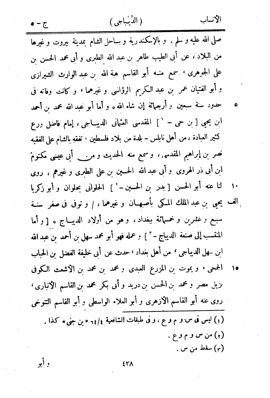 صلى الله عليه وسلم، وبالإسكندرية وبساحل الشام بمدينة بيروت وغيرها من البلاد، عن أبى الطيب طاهر بن عبد الله الطبري وأبى محمد الحسن بن على الجوهري، سمع منه أبو القاسم هبة الله بن عبد الوارث الشيرازي وأبو الفتيان عمر بن عبد الكريم الرؤاسى وغيرهما، وكانت وفاته في حدود سنة سبعين وأربعمائة إن شاء الله وأما أبو عبد الله محمد بن أحمد ابن يحيى [بن حي-[1]] المقدسي العثماني الديباجي، إمام فاضل ورع كثير العبادة، من أهل نابلس- بلدة من بلاد فلسطين، تفقه بالشام على الفقيه نصر بن إبراهيم المقدسي، وسمع منه الحديث ومن أبى عيسى مكتوم ابن أبى ذر الهروي وأبى عبد الله الحسين بن على الطبري وغيرهم، روى لنا عنه أبو الحسن [بدر بن الحسين-[2]] الحلواني بحلوان وأبو زكريا يحيى بن عبد الملك المكيّ بأصبهان وغيرهما،/ وتوفى في صفر سنة سبع وعشرين وخمسمائة ببغداد، وهو من أولاد الديباج [وأما المنتسب إلى صنعة الديباج-[3]] وعمله فهو أبو محمد سهل بن أحمد بن عبد الله ابن سهل الديباجي، من أهل بغداد، حدث عن أبى خليفة الفضل بن الحباب الجمحيّ، ويموت بن المزرع العبديّ ومحمد بن محمد بن الأشعث الكوفي يزيل مصر ومحمد بن الحسن بن دريد وأبى بكر محمد بن القاسم الأنباري، روى عنه أبو القاسم الأزهري وأبو العلاء الواسطي وأبو القاسم التنوخي