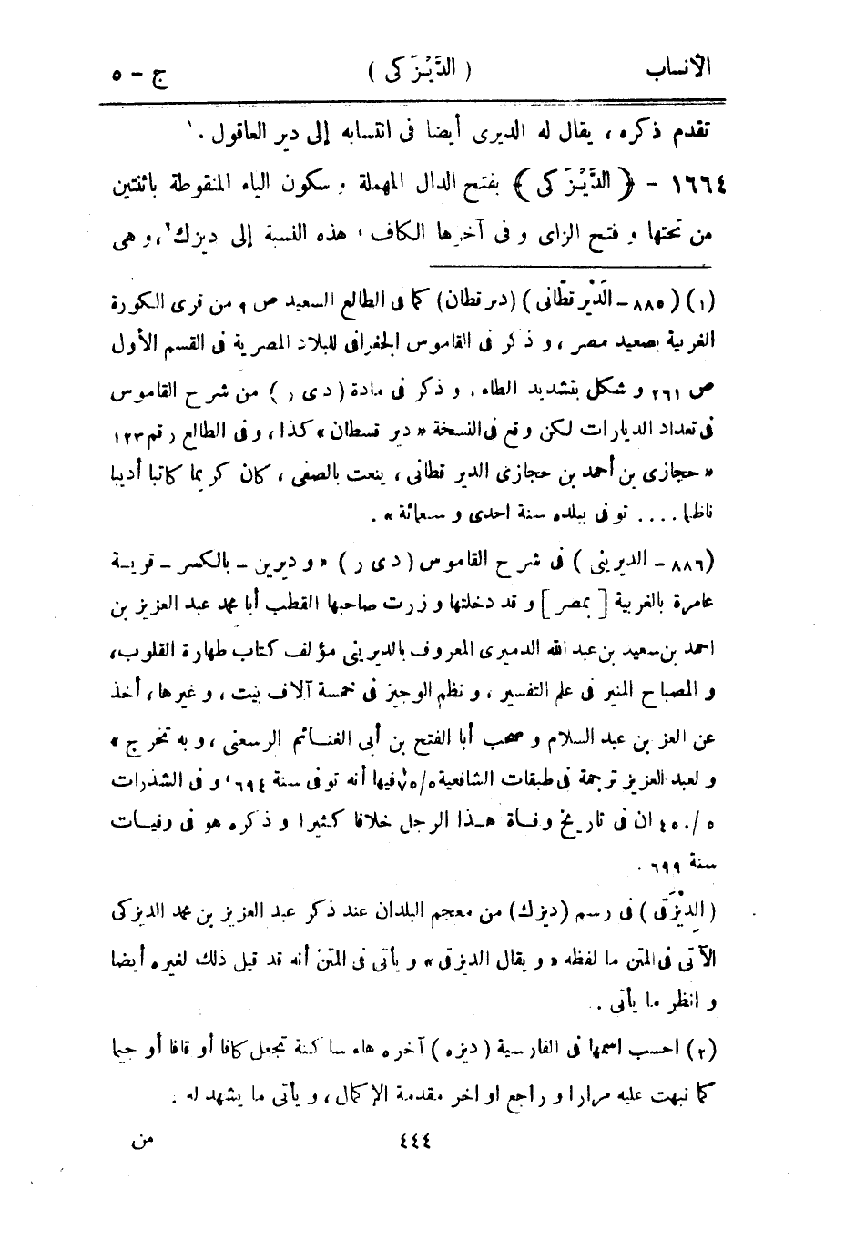 (الديزقى) في رسم (ديزك) من معجم البلدان عند ذكر عبد العزيز بن محمد الديزكى الآتي في المتن ما لفظه «ويقال الديزقى» ويأتى في المتن أنه قد قيل ذلك لغيره أيضا وانظر ما يأتى.